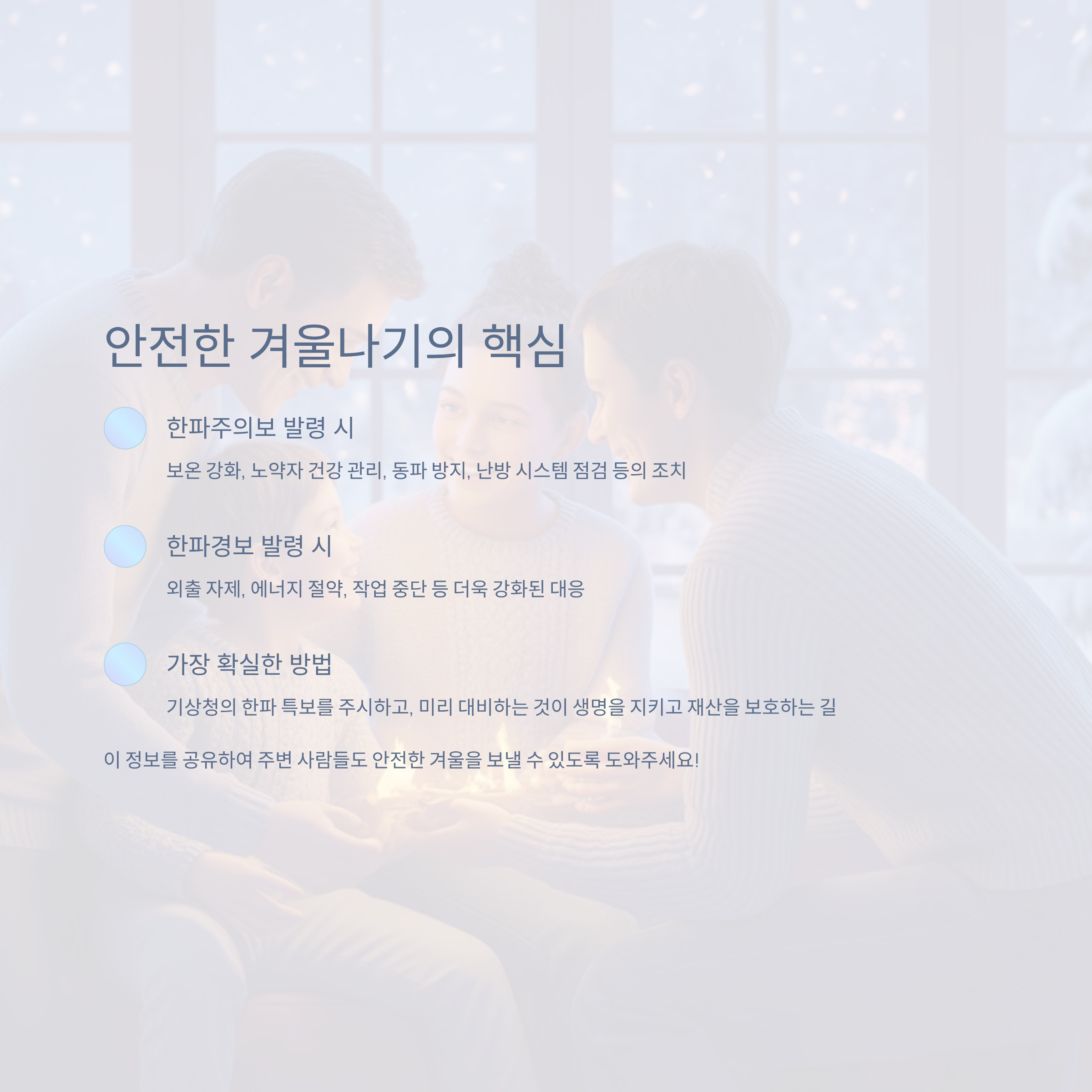 기상청의 한파 특보를 주시하고, 미리 대비하는 것이 생명을 지키고 재산을 보호하는 가장 확실한 방법입니다.