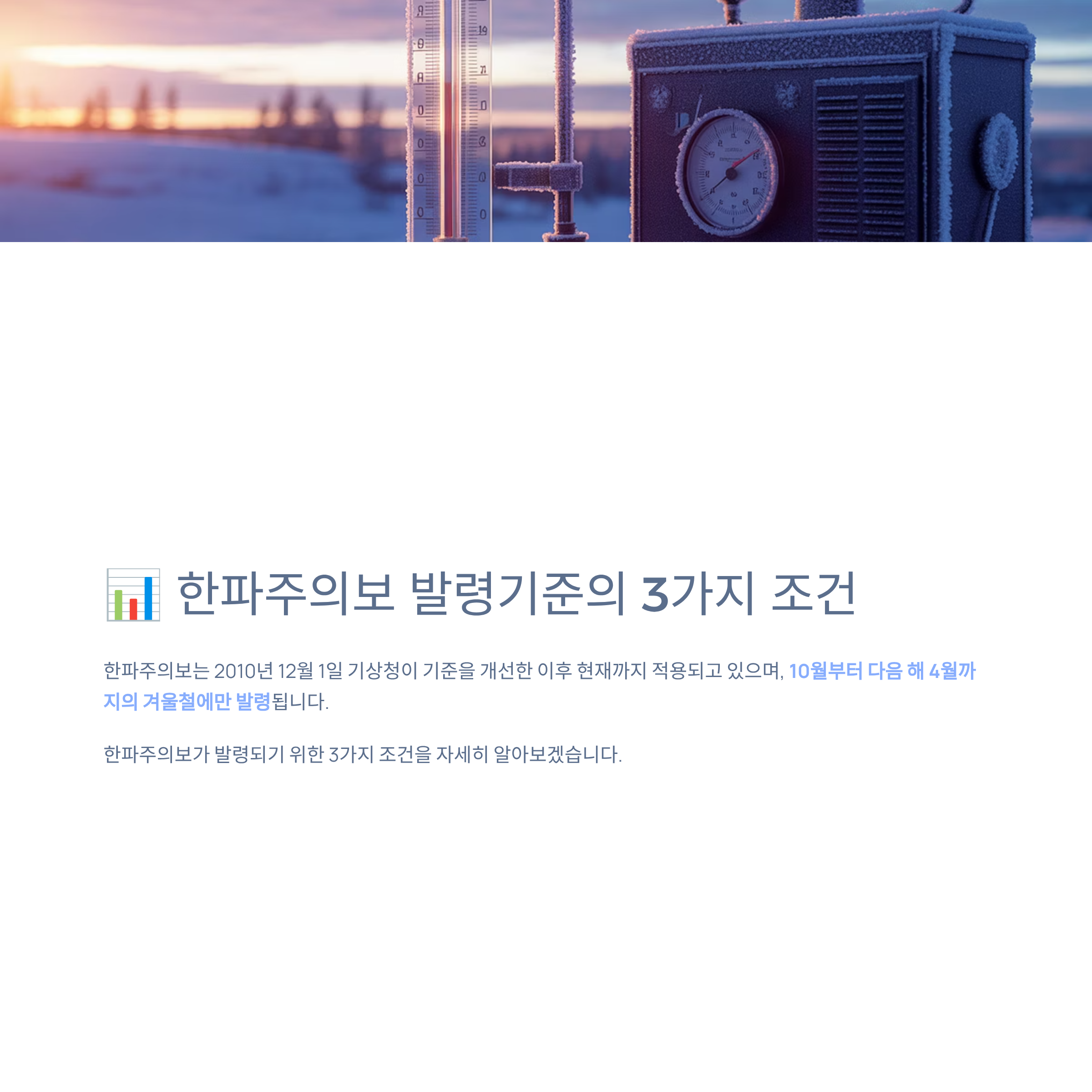 2025년 현재 한파주의보는 기상청이 정한 3가지 조건 중 하나라도 충족하면 발령되며, 단순히 "추운 날씨"를 의미하는 것이 아니라 인체·농작물·시설물에 실질적 피해가 발생할 수 있는 상황을 나타냅니다.