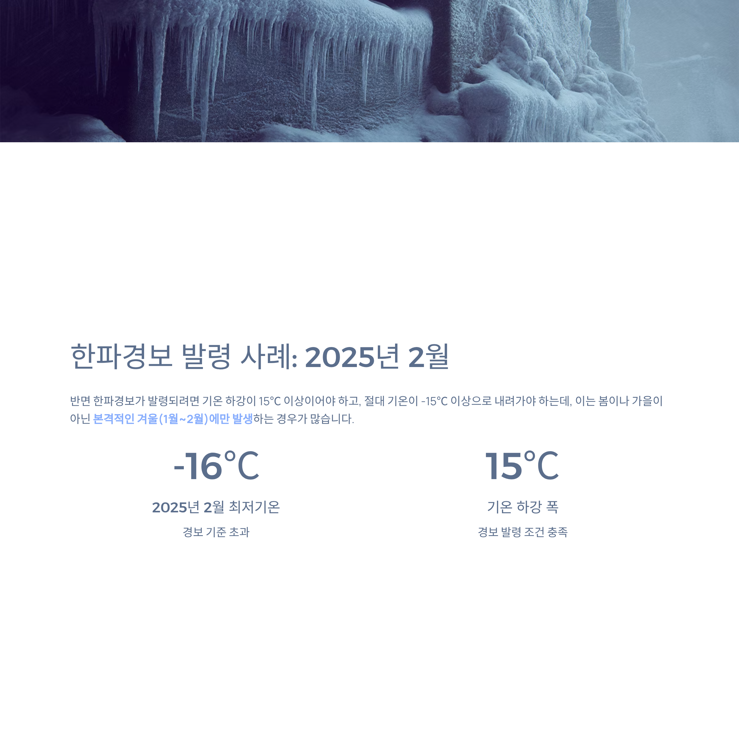 반면 한파경보가 발령되려면 기온 하강이 15℃ 이상이어야 하고, 절대 기온이 -15℃ 이상으로 내려가야 하는데, 이는 봄이나 가을이 아닌 본격적인 겨울(1월~2월)에만 발생하는 경우가 많습니다.