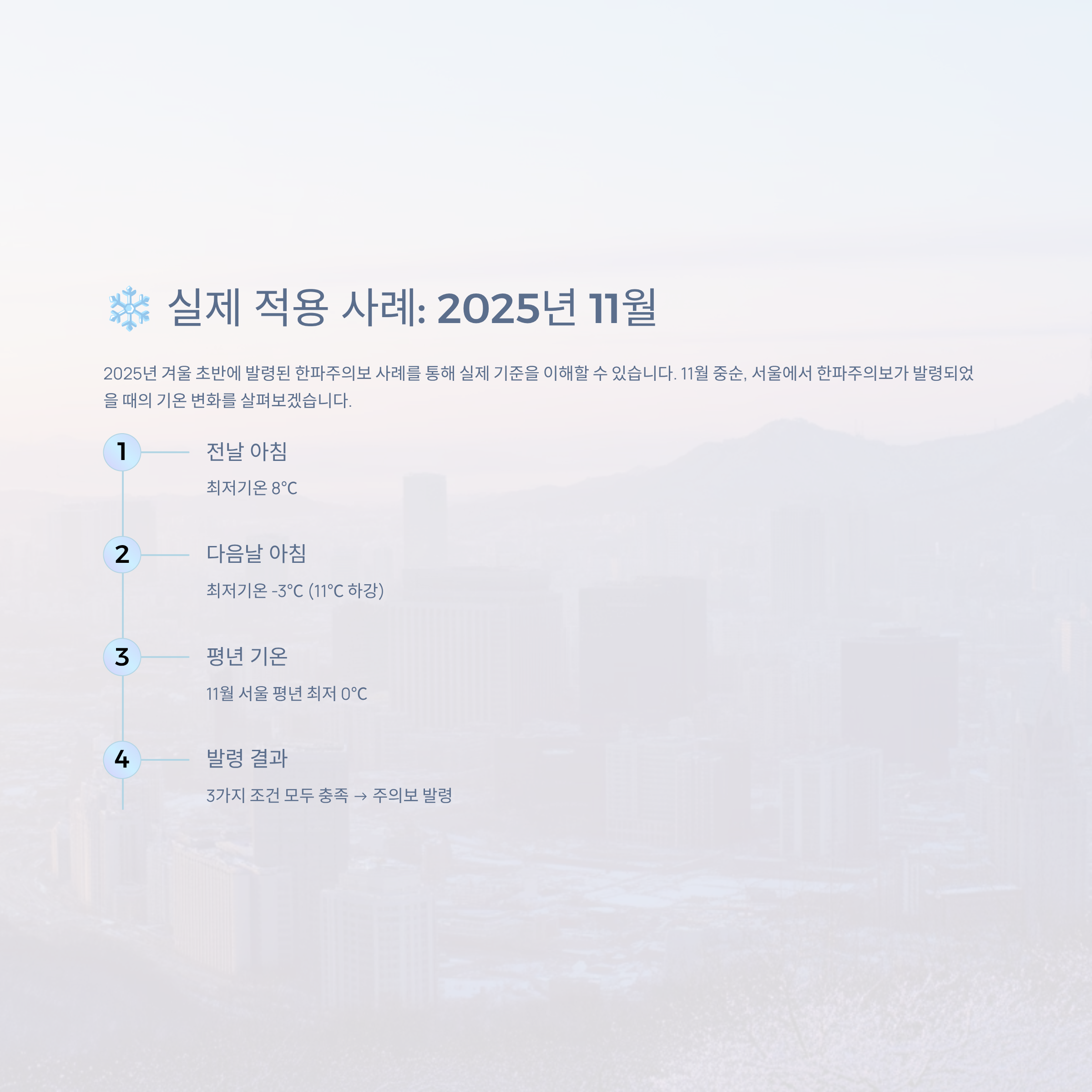 또한 당시 11월 서울의 평년 최저기온이 0℃였으므로, 예상 기온 -3℃는 평년보다 3℃ 낮았습니다. 이렇게 되면 "기온 하강 10℃ 이상", "절대 기온 3℃ 이하", "평년보다 3℃ 낮음" 세 조건을 모두 충족하여 한파주의보가 발령된 것입니다.