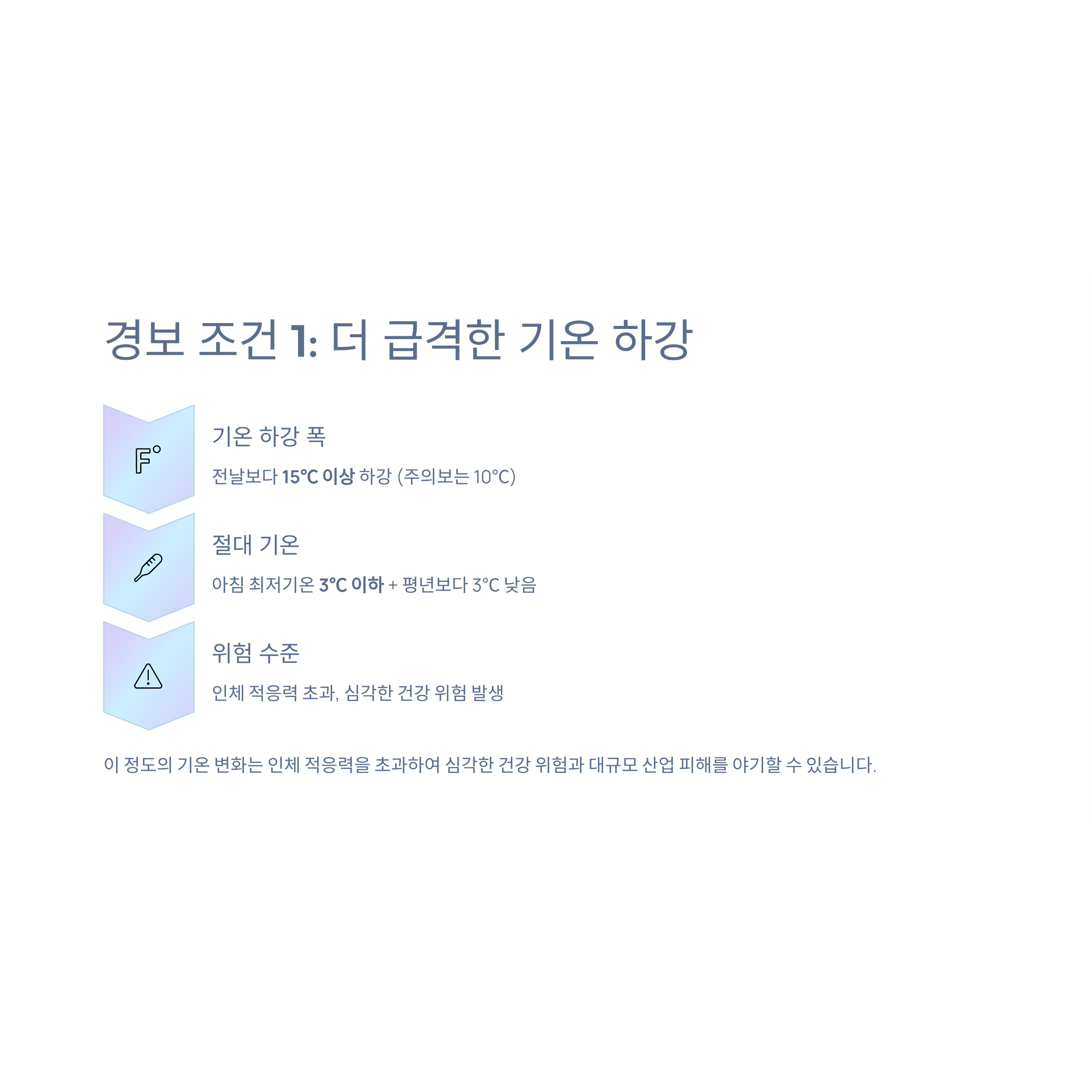 한파주의보는 기온 10℃ 이상 하강, -12℃ 이하 2일 지속, 또는 중대한 피해 예상 시 발령되며, 한파경보는 15℃ 이상 하강, -15℃ 이하 2일 지속, 또는 광범위 피해 예상 시 발령됩니다.
