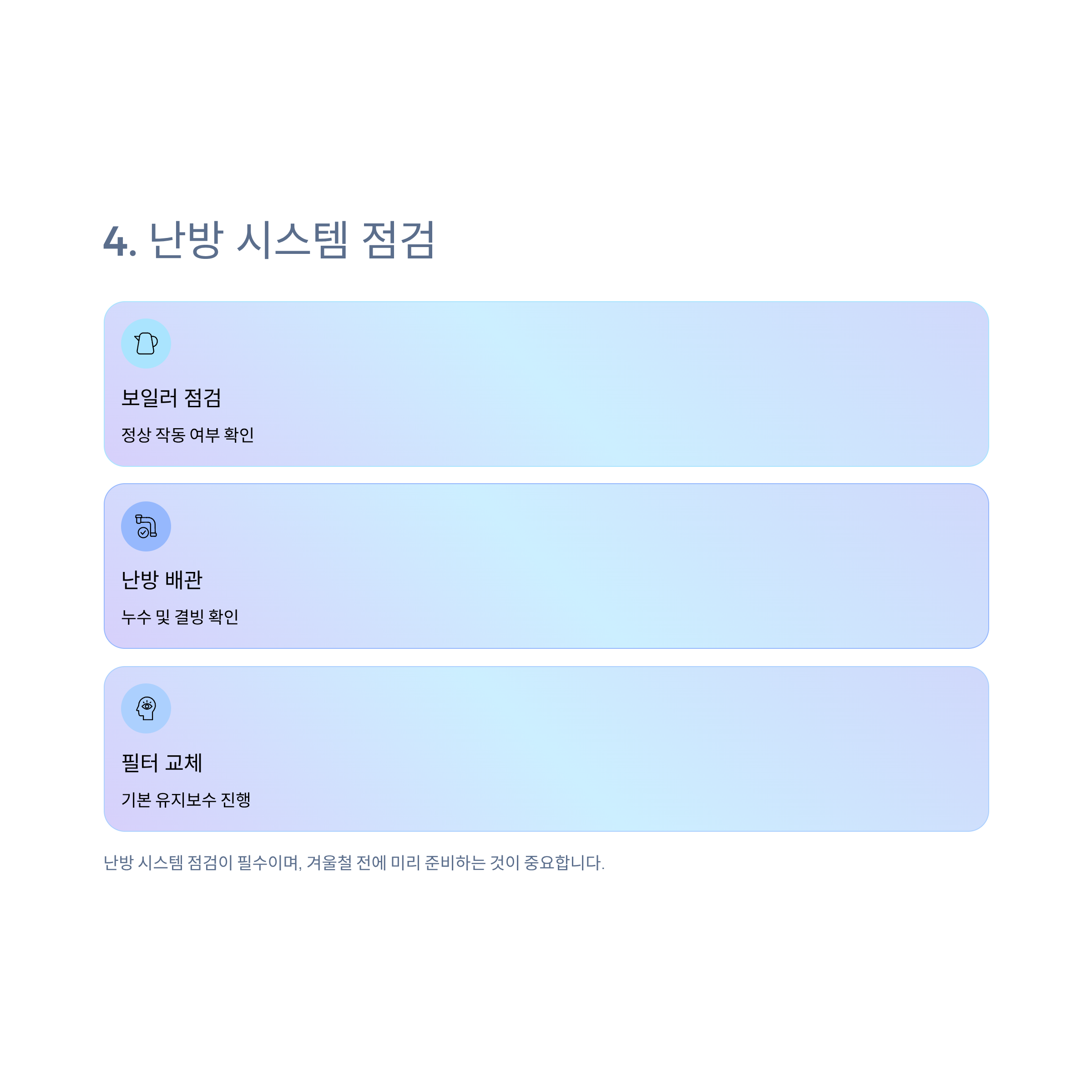 넷째, 난방 시스템 점검이 필수입니다. 보일러와 난방 배관의 정상 작동 여부를 확인하고, 필터 교체 등 기본 유지보수를 진행해야 합니다.