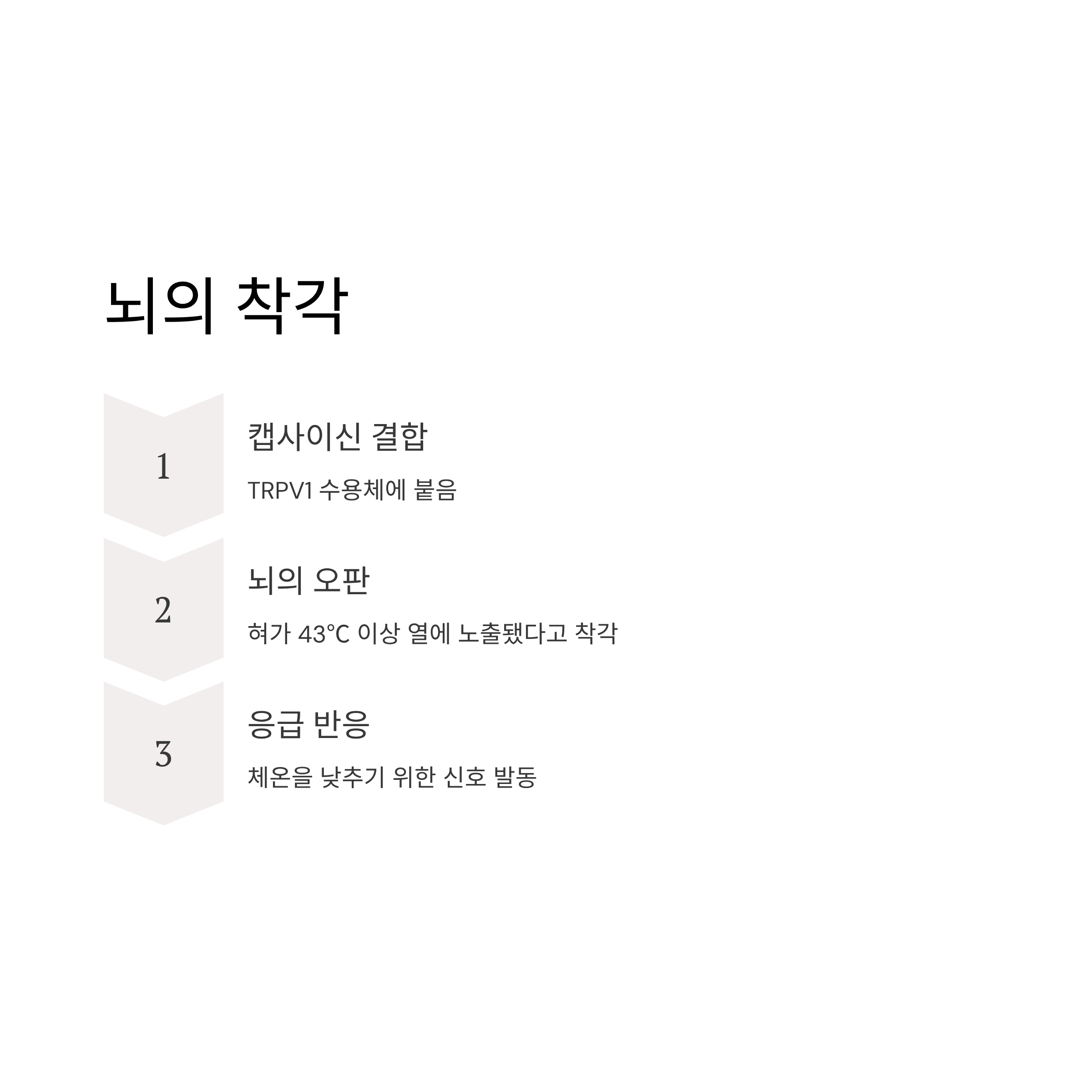 따라서 캡사이신이 TRPV1에 붙으면 뇌는 혀가 뜨거운 열에 노출된 것이라고 착각하게 되는 것입니다.