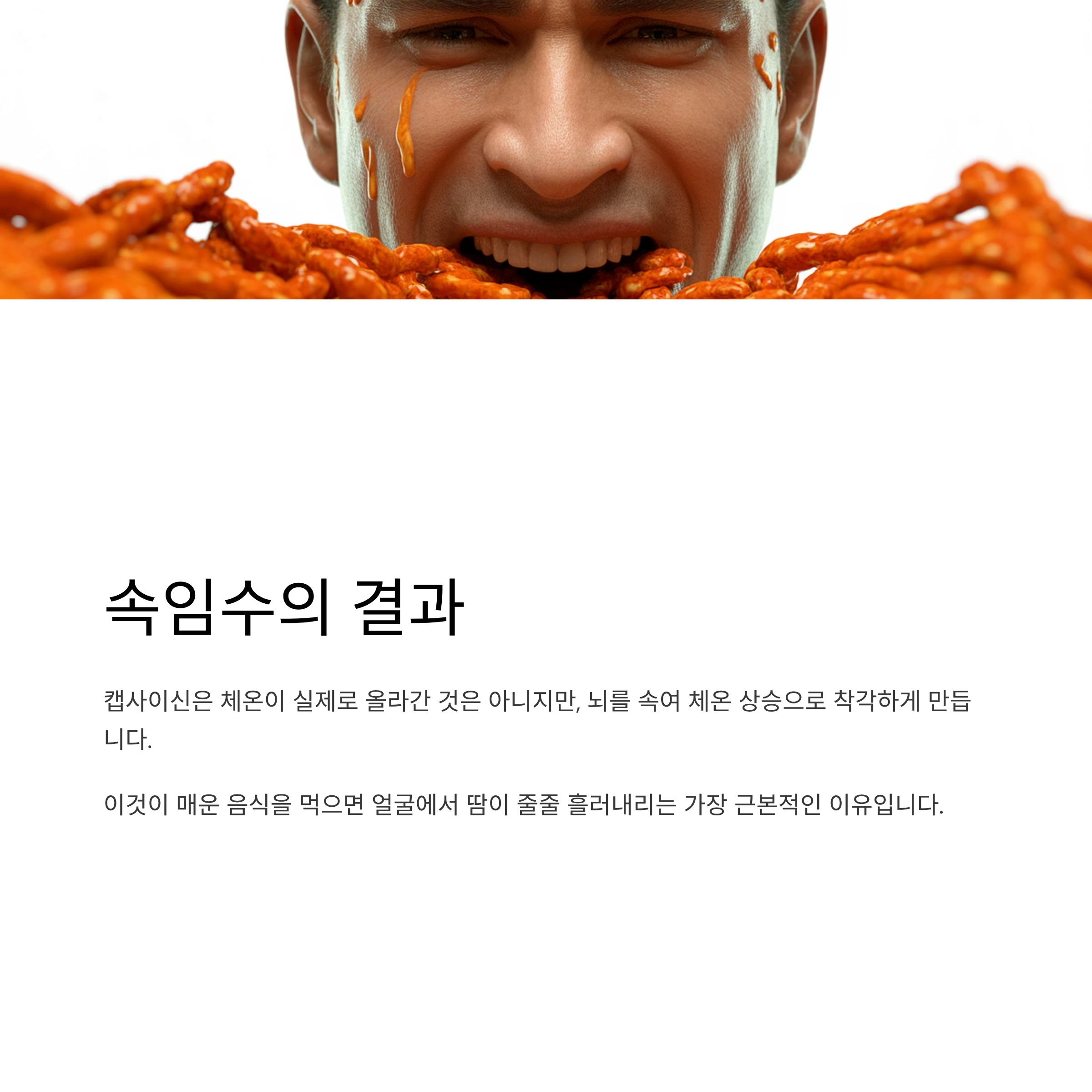 이것이 매운 음식을 먹으면 얼굴에서 땀이 줄줄 흘러내리는 가장 근본적인 이유입니다. 캡사이신은 체온이 실제로 올라간 것은 아니지만, 뇌를 속여 체온 상승으로 착각하게 만드는 속임수를 쓰는 것입니다.