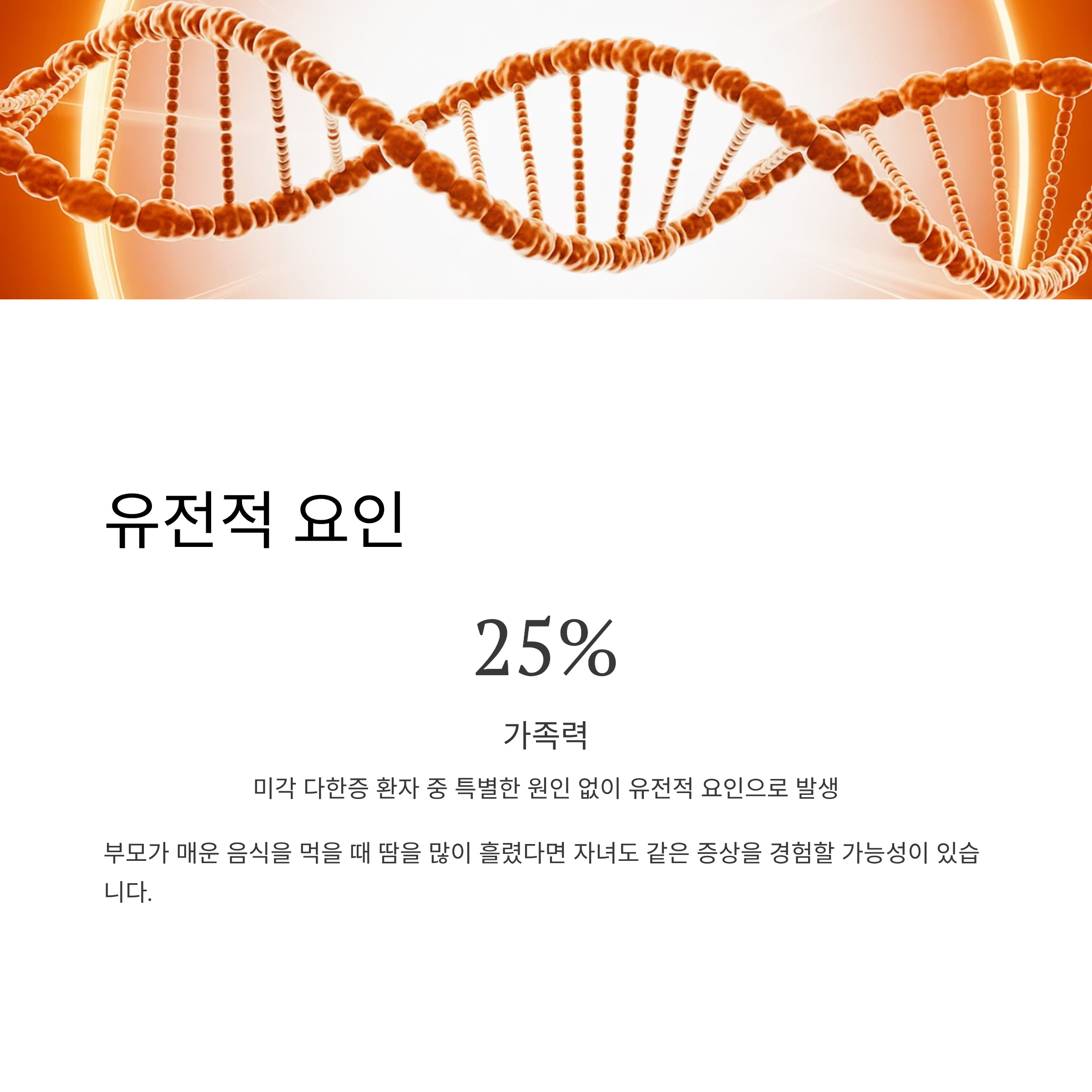 흥미롭게도, 미각 다한증 환자의 약 25%는 특별한 원인 없이 유전적 요인(가족력)으로 인해 이 증상을 경험합니다.