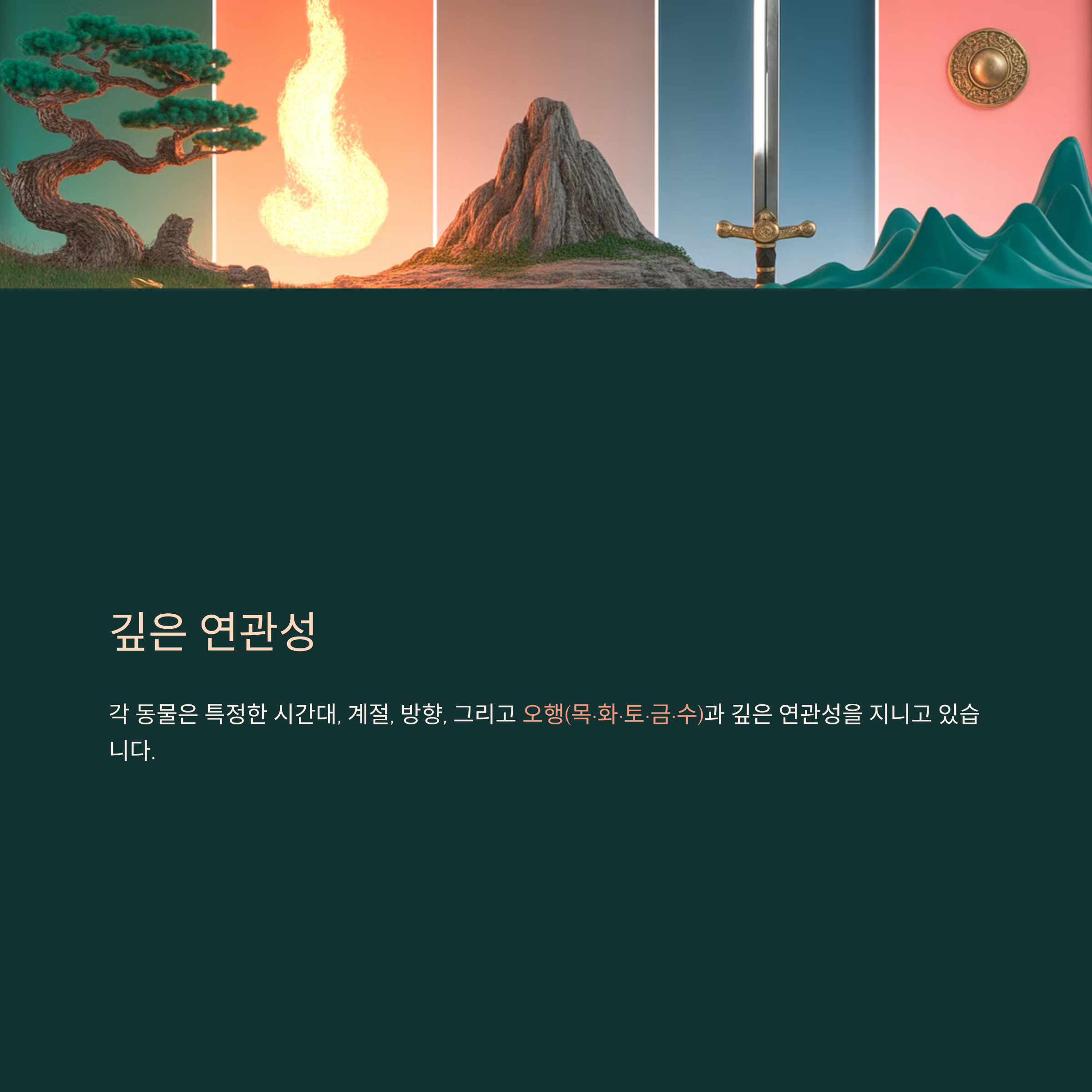 각 동물은 특정한 시간대, 계절, 방향, 그리고 오행(목·화·토·금·수)과 깊은 연관성을 지니고 있습니다.
