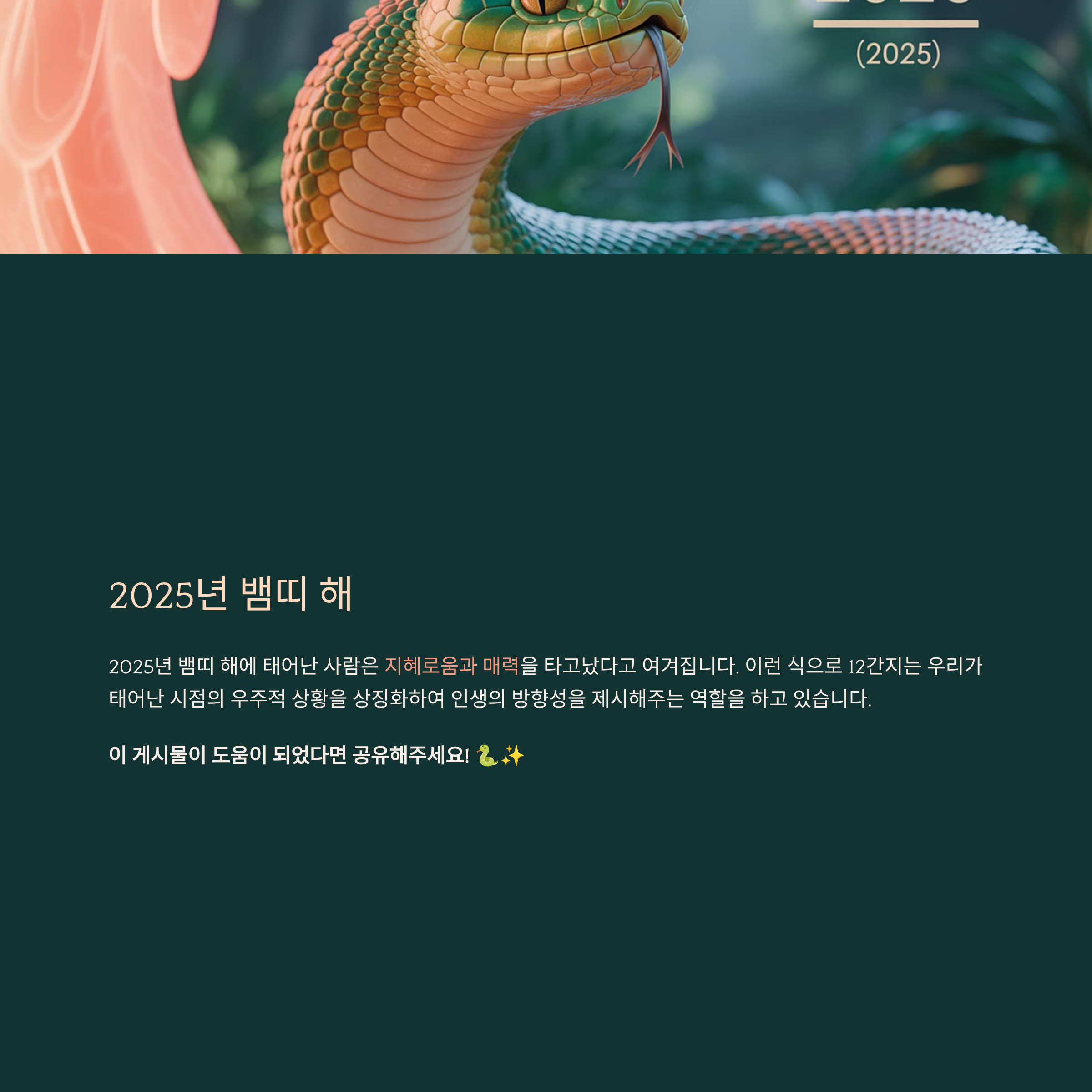2025년 뱀띠 해에 태어난 사람은 지혜로움과 매력을 타고났다고 여겨집니다. 이런 식으로 12간지는 우리가 태어난 시점의 우주적 상황을 상징화하여 인생의 방향성을 제시해주는 역할을 하고 있습니다.