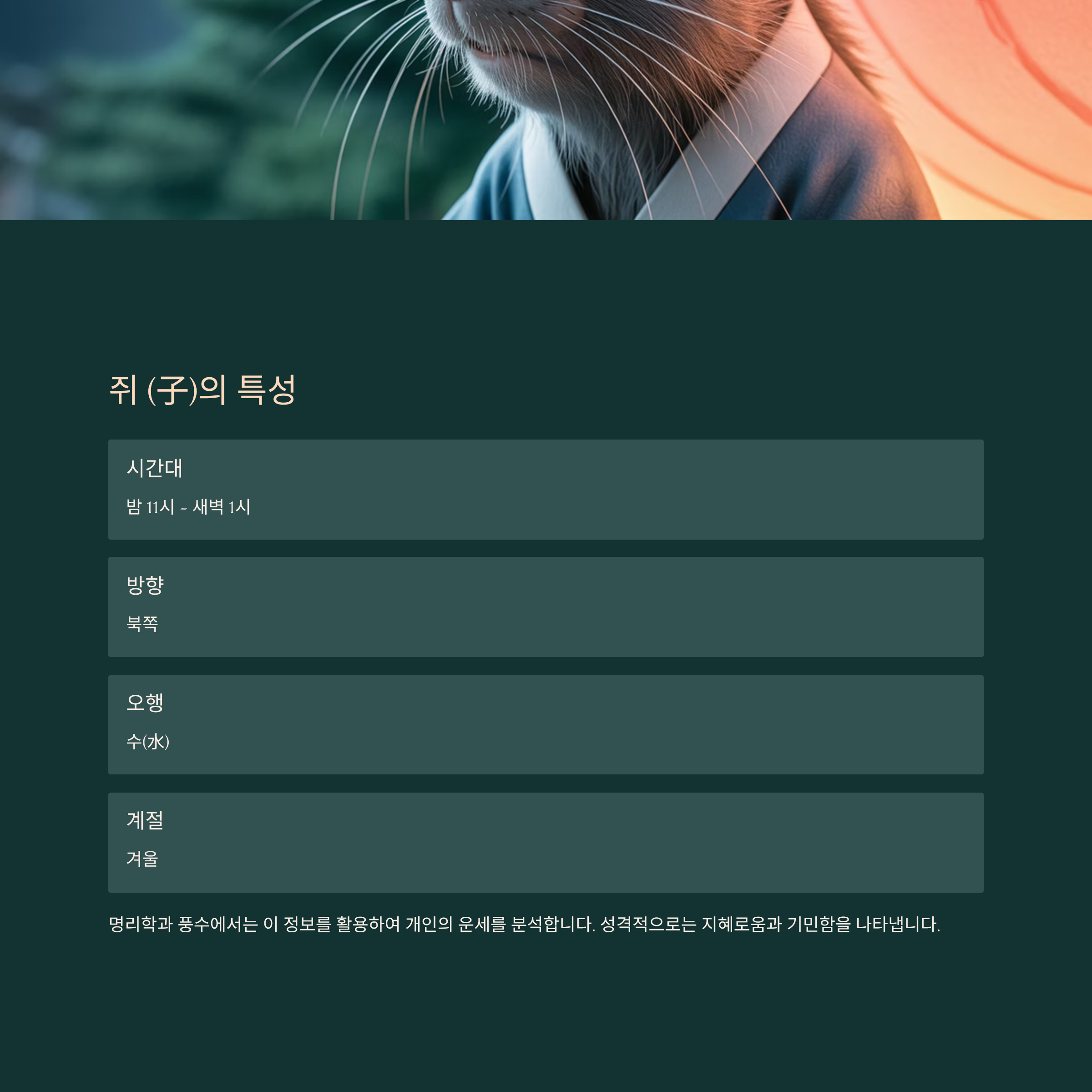 쥐(子)는 밤 11시부터 새벽 1시까지의 시간대를 관장하며, 방향으로는 북쪽을 나타냅니다.