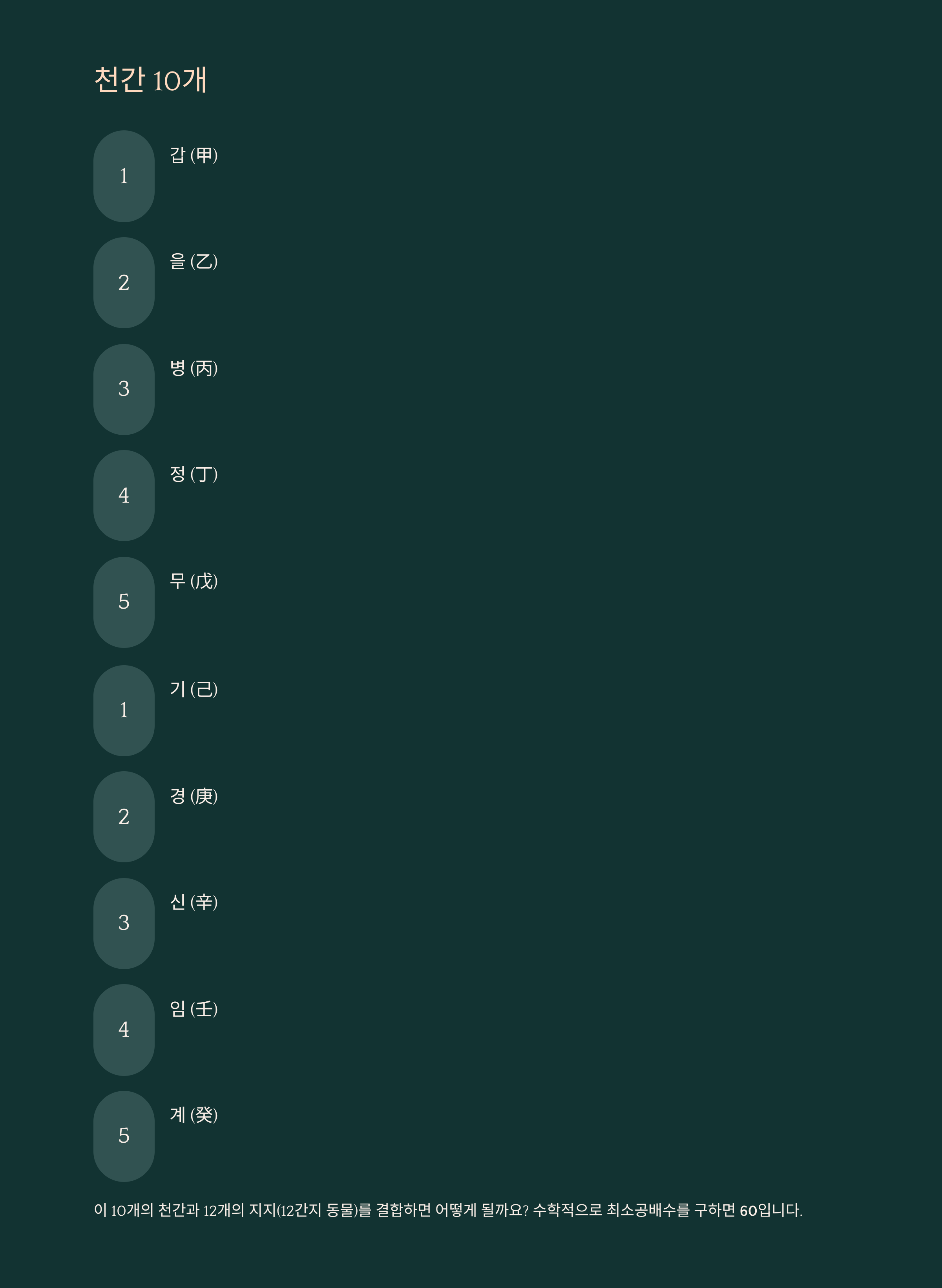 이 10개의 천간과 12개의 지지(12간지 동물)를 결합하면 어떻게 될까요? 수학적으로 최소공배수를 구하면 60입니다.
