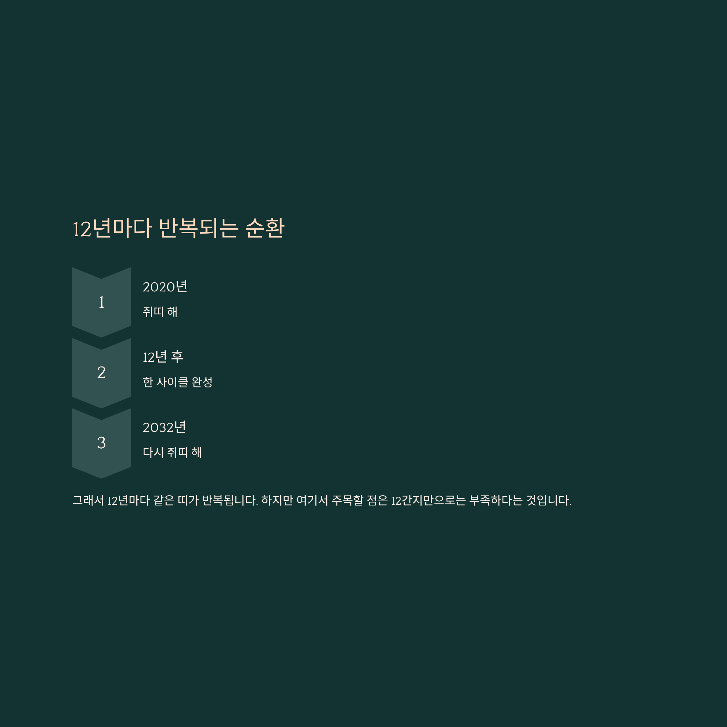 그래서 12년마다 같은 띠가 반복됩니다. 쥐띠 해가 있으면 12년 후에 다시 쥐띠 해가 옵니다.