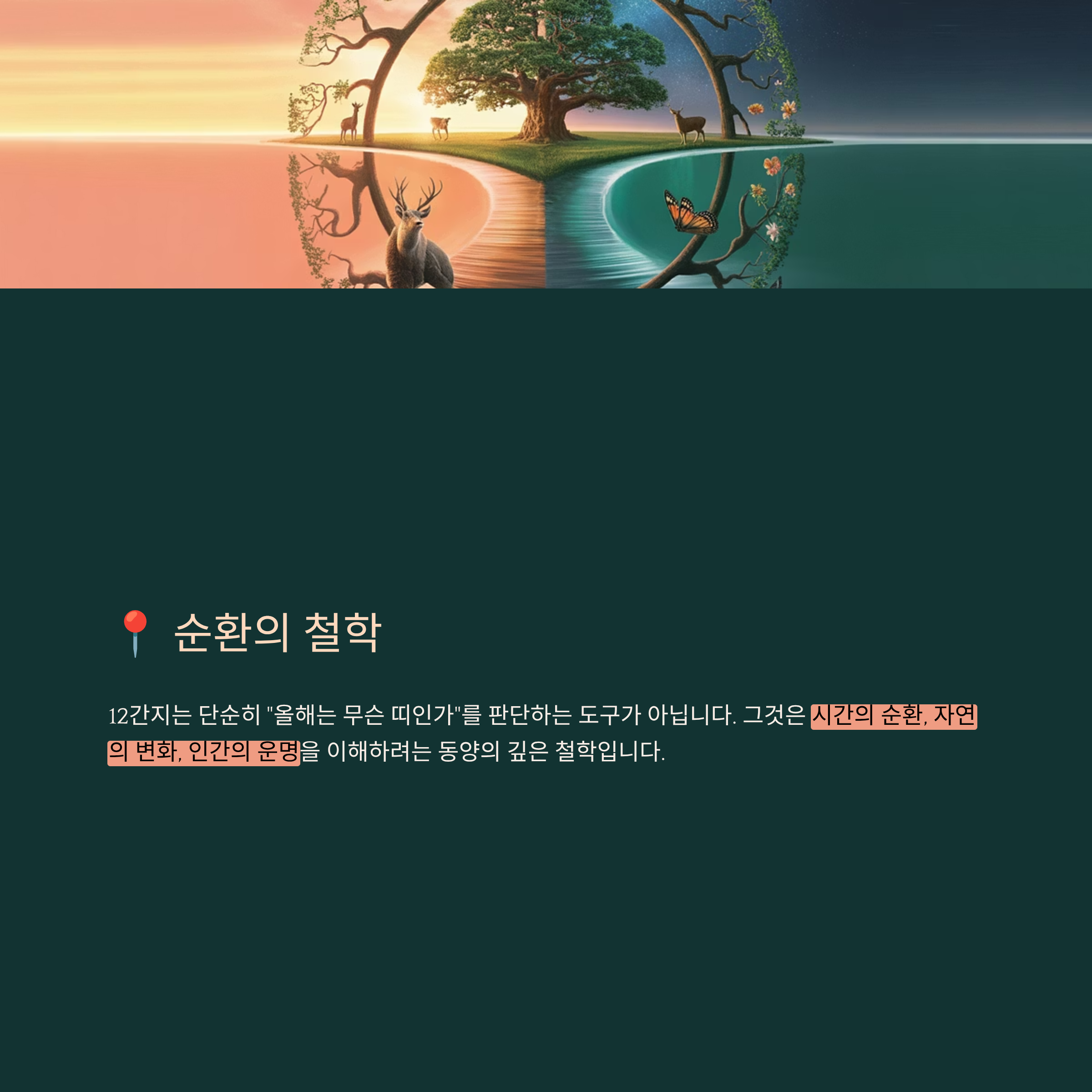12간지는 단순히 "올해는 무슨 띠인가"를 판단하는 도구가 아닙니다. 그것은 시간의 순환, 자연의 변화, 인간의 운명을 이해하려는 동양의 깊은 철학입니다.
