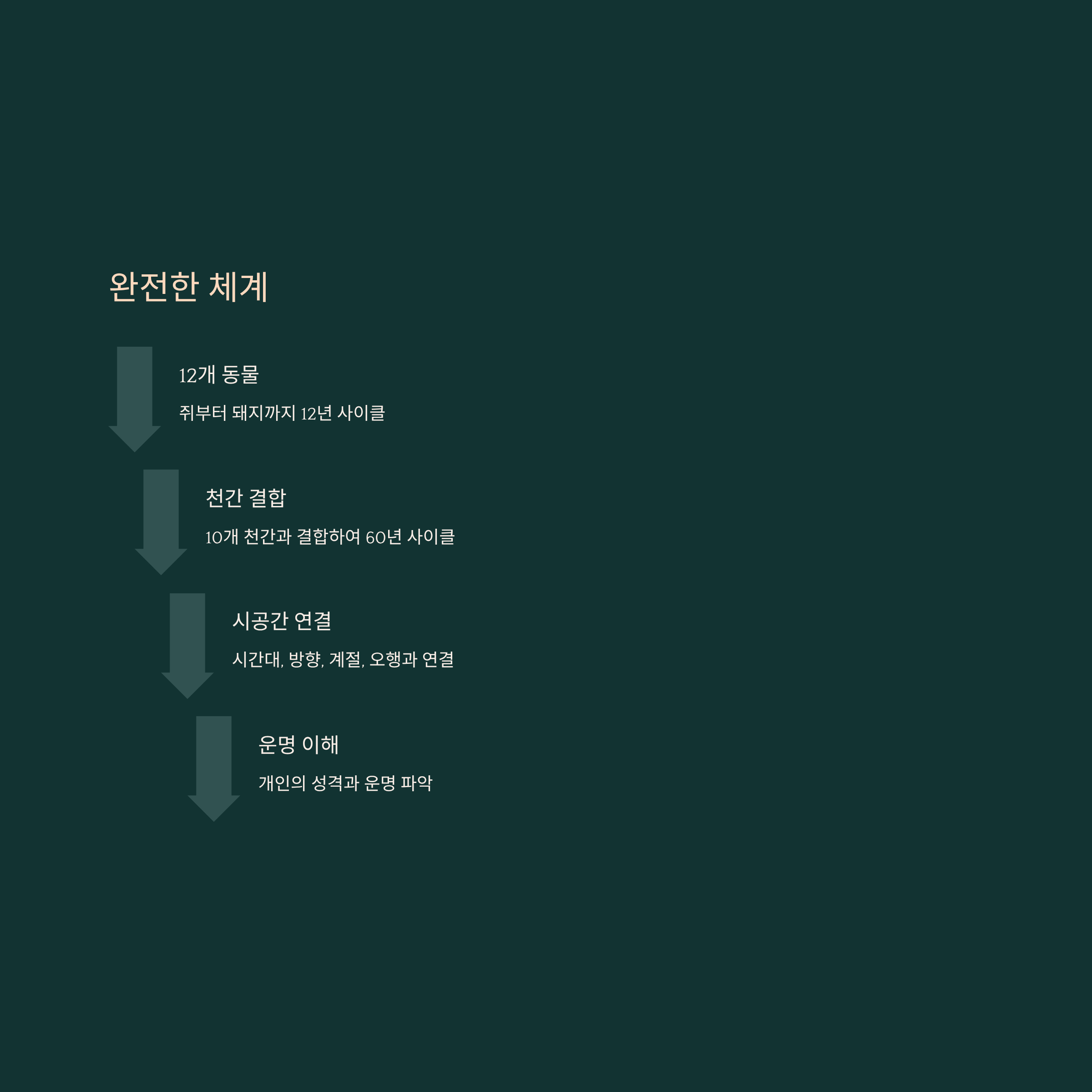 쥐부터 돼지까지 12개의 동물이 12년을 한 사이클로 돌고, 천간 10개와 결합하여 60년을 한 시대로 봅니다. 각 동물은 특정한 시간대, 방향, 계절, 오행과 연결되어 있으며, 개인의 성격과 운명을 이해하는 데 도움을 줍니다.