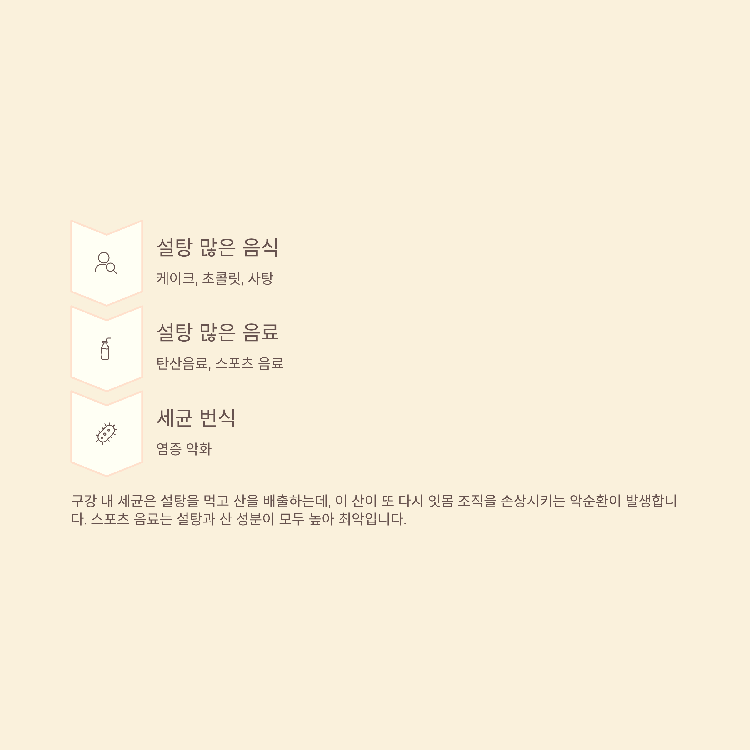 구강 내 세균은 설탕을 먹고 산을 배출하는데, 이 산이 또 다시 잇몸 조직을 손상시키는 악순환이 발생합니다.