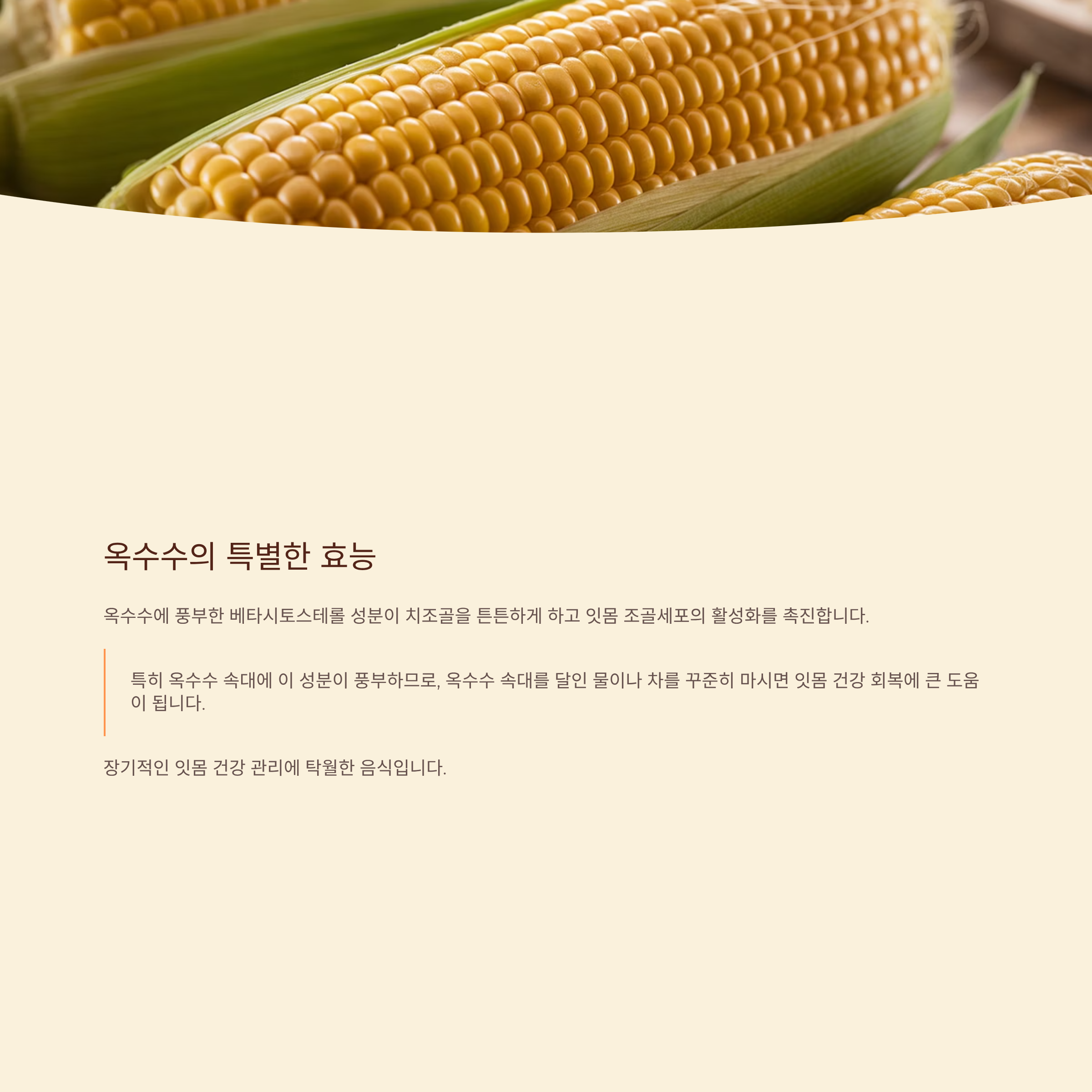 특히 옥수수 속대에 이 성분이 풍부하므로, 옥수수 속대를 달인 물이나 차를 꾸준히 마시면 잇몸 건강 회복에 큰 도움이 됩니다.