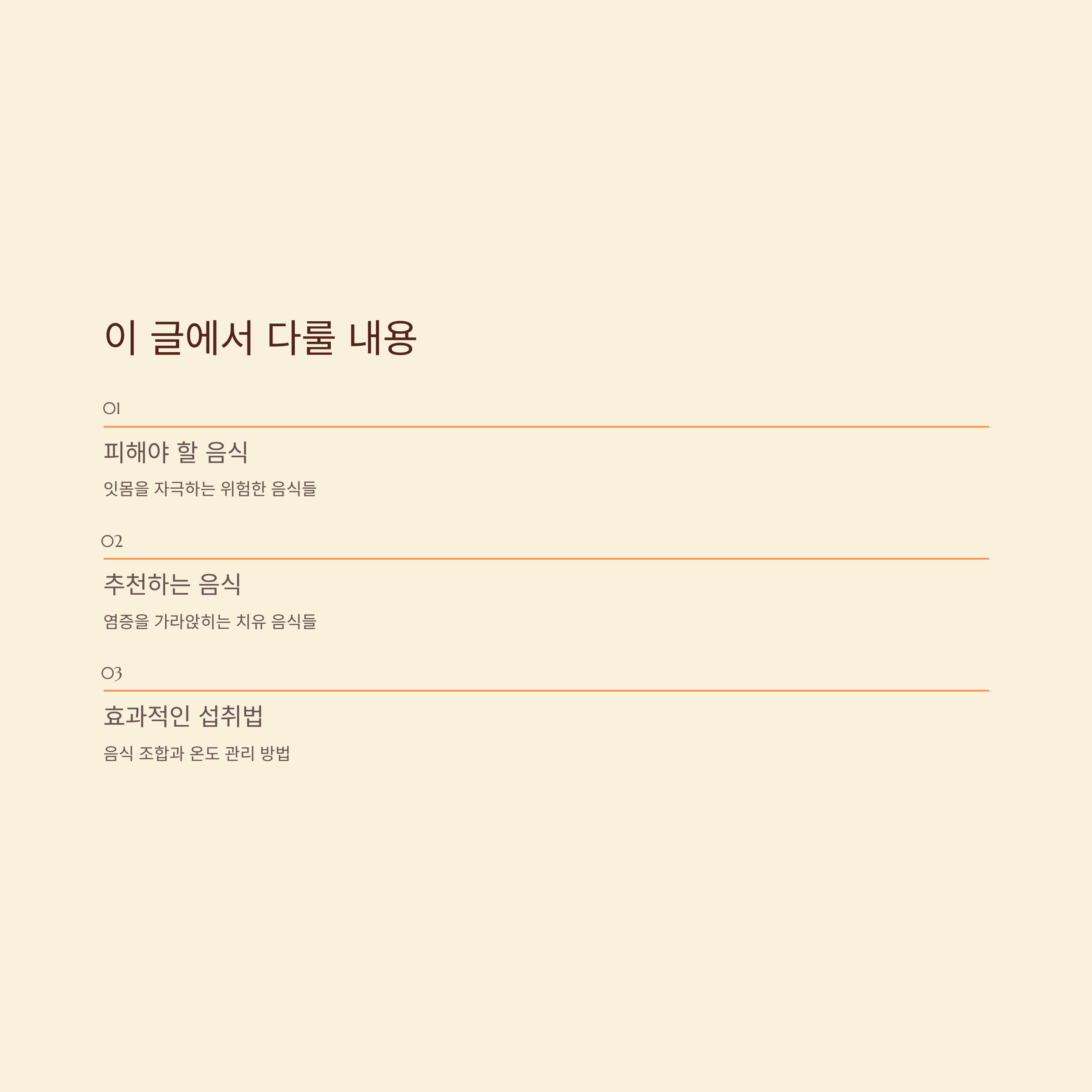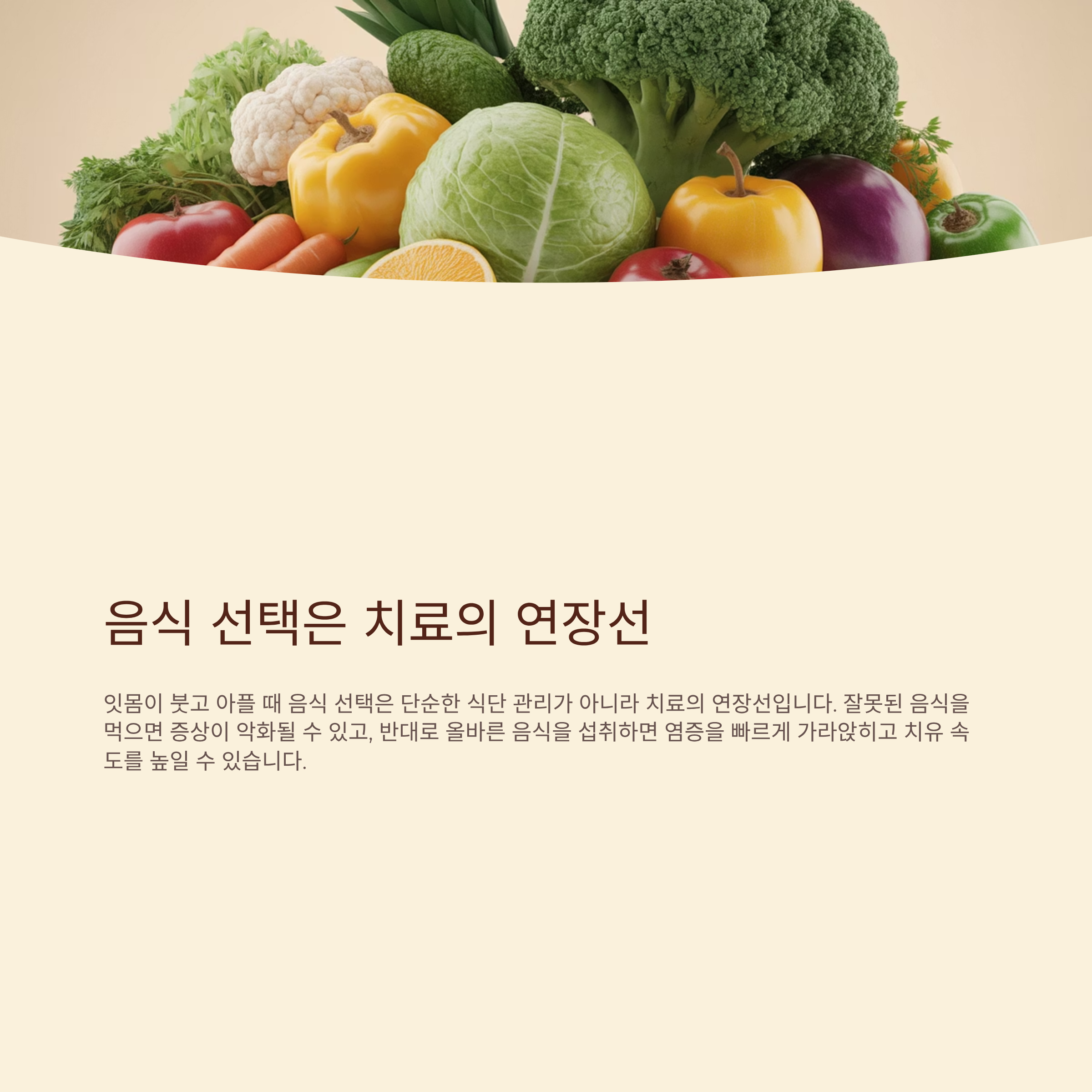 잘못된 음식을 먹으면 증상이 악화될 수 있고, 반대로 올바른 음식을 섭취하면 염증을 빠르게 가라앉히고 치유 속도를 높일 수 있습니다.