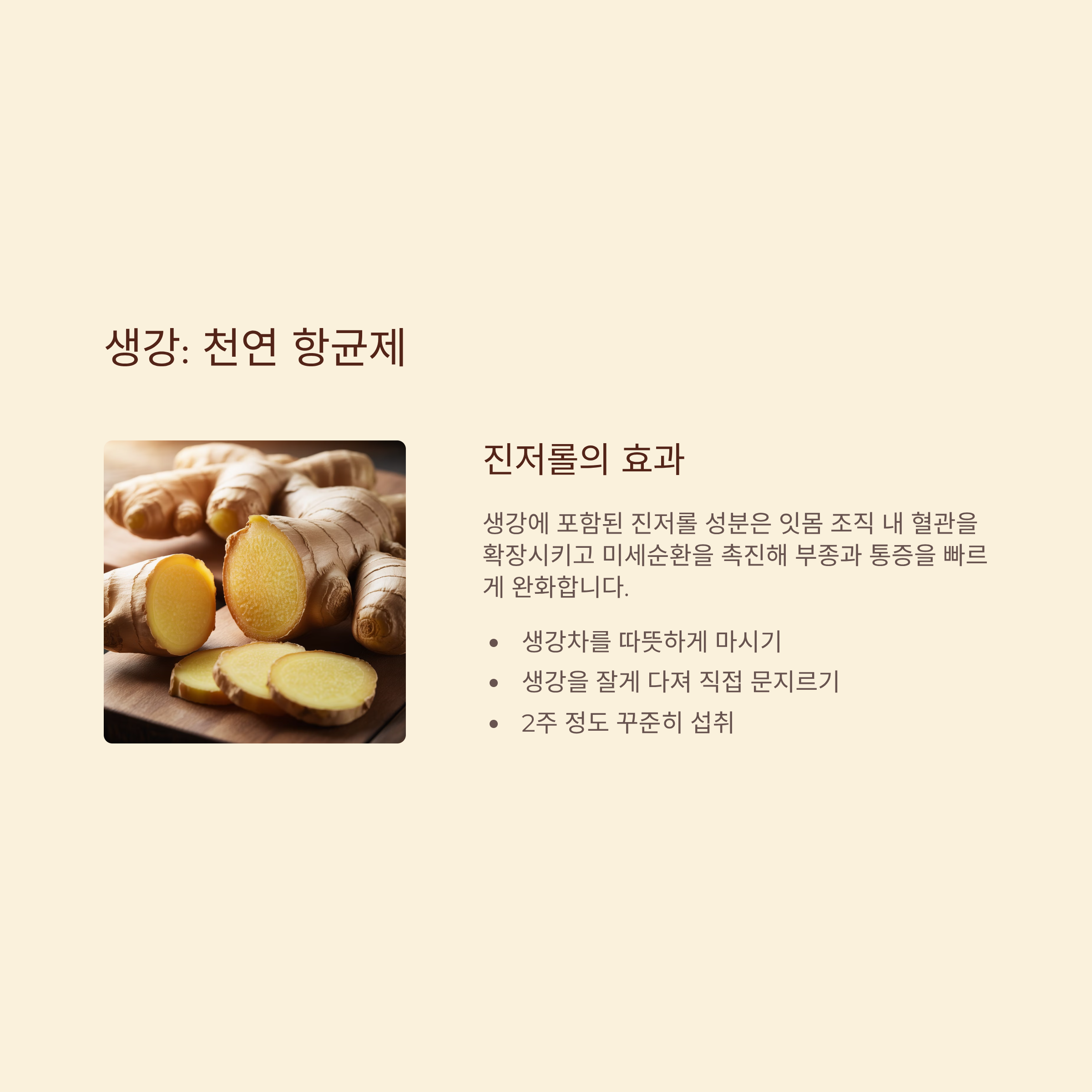생강은 구강 내 염증 억제의 천연 항균제입니다. 생강에 포함된 진저롤이라는 성분은 잇몸 조직 내 혈관을 확장시키고 미세순환을 촉진해 부종과 통증을 빠르게 완화합니다.
