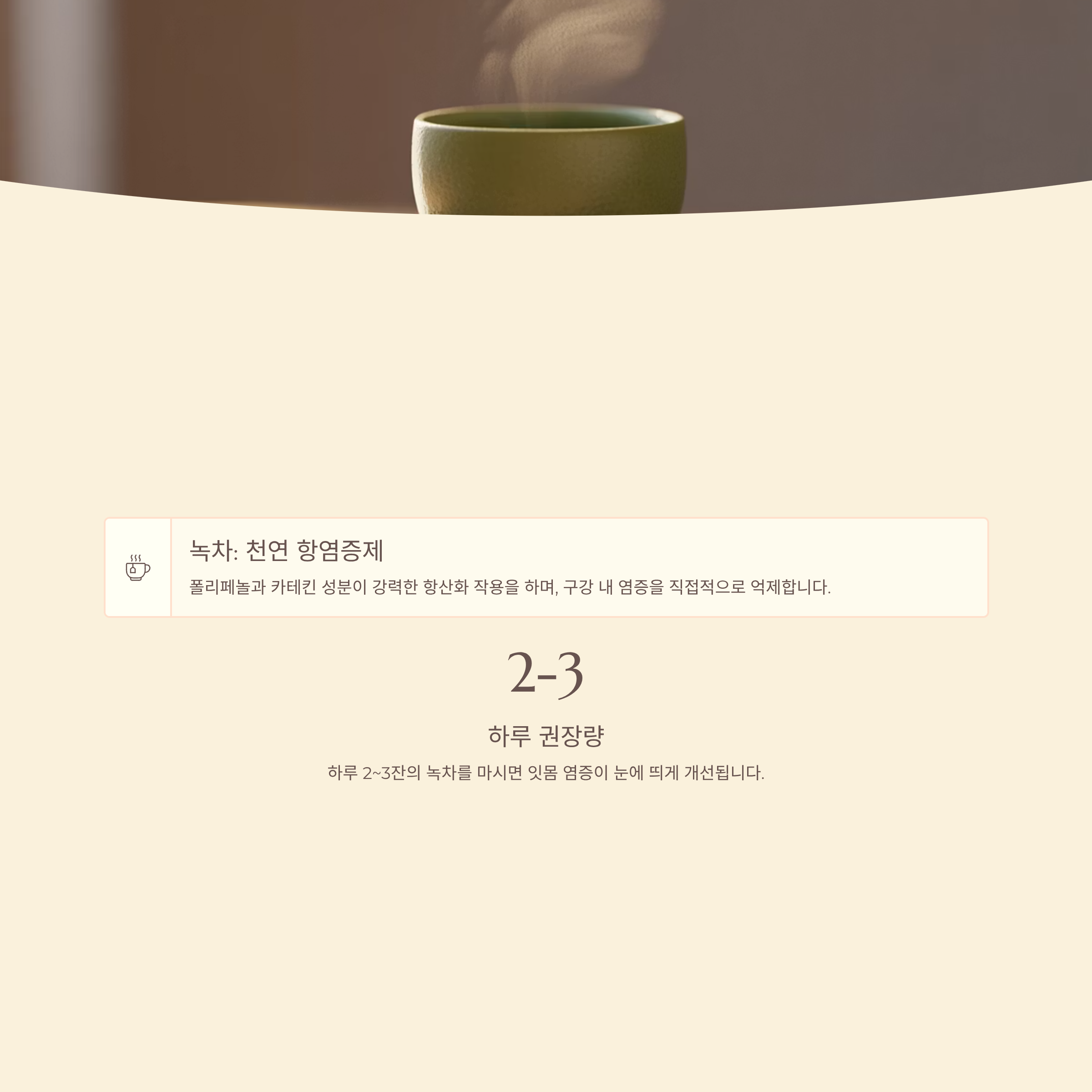 녹차는 천연 항염증제입니다. 녹차에 함유된 폴리페놀과 카테킨 성분은 강력한 항산화 작용을 하며, 구강 내 염증을 직접적으로 억제합니다.