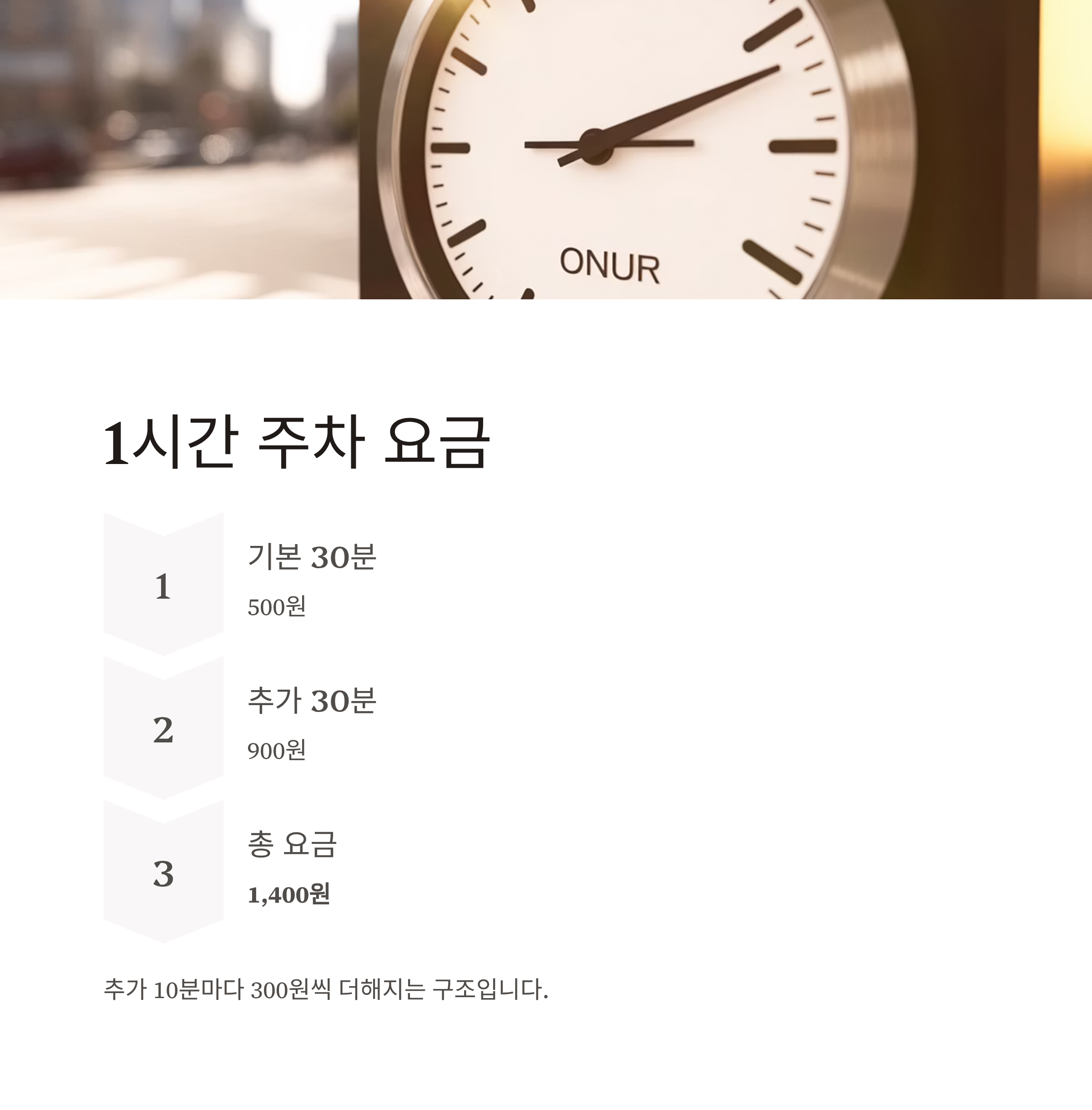 따라서 1시간 주차 시 기본 30분 500원에 추가 30분 900원이 더해져 총 1,400원이 소요됩니다.