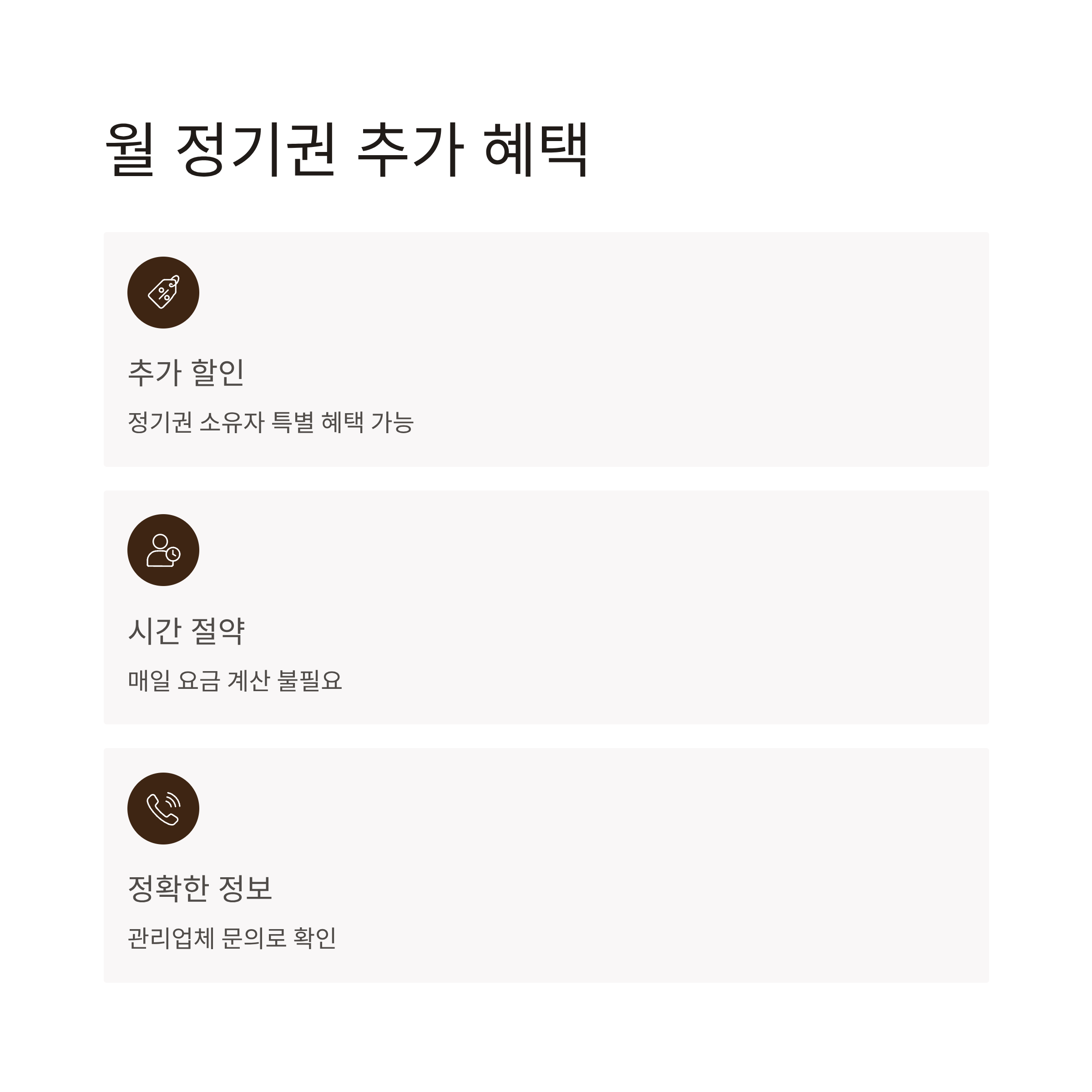 정기권을 사용하면 매일 출차할 때마다 요금을 계산할 필요가 없어 시간 절약도 가능합니다.