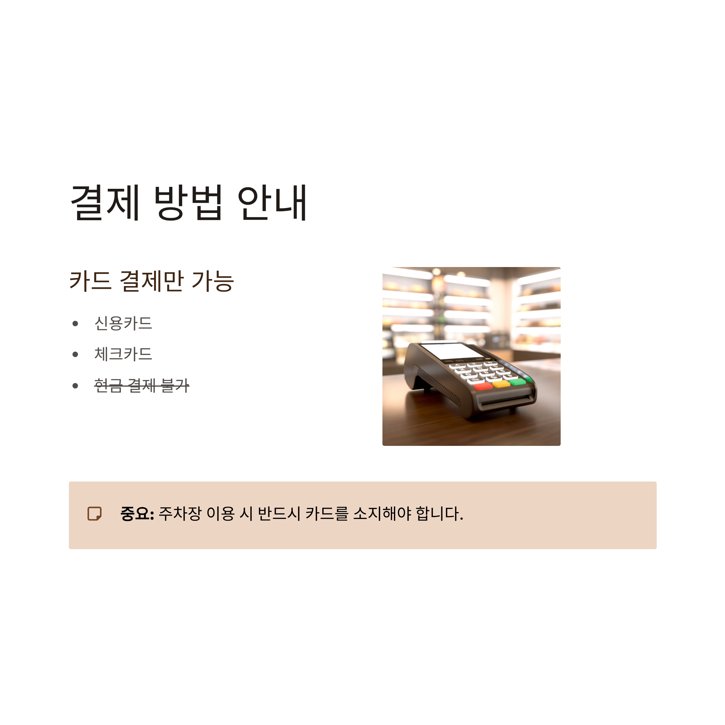 첫째, 현금 결제가 불가능하므로 반드시 카드를 지참해야 합니다.