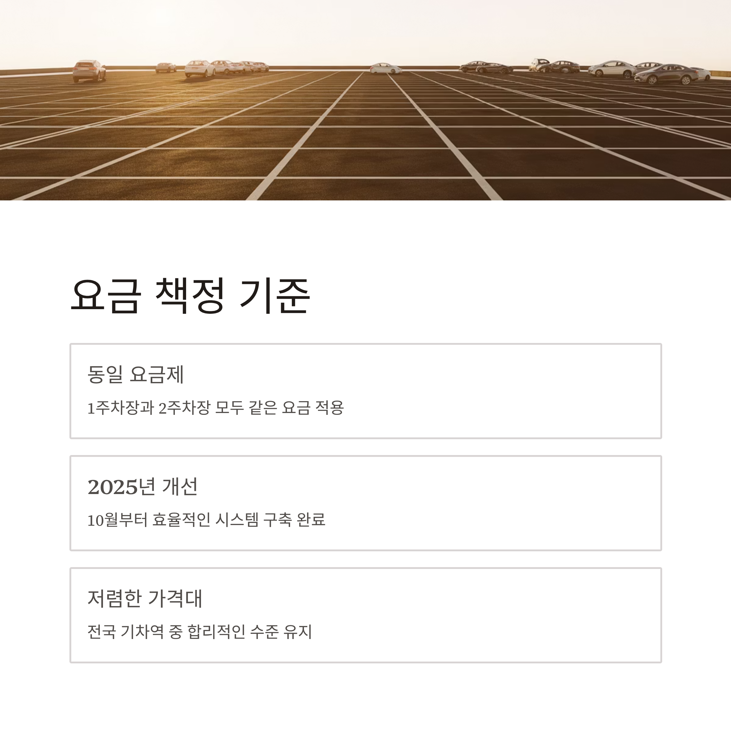강릉역 1주차장과 2주차장의 요금은 동일하게 책정되어 있으며, 2025년 10월부터 운영 방식이 개선되어 더욱 효율적인 주차 시스템이 구축되었습니다.