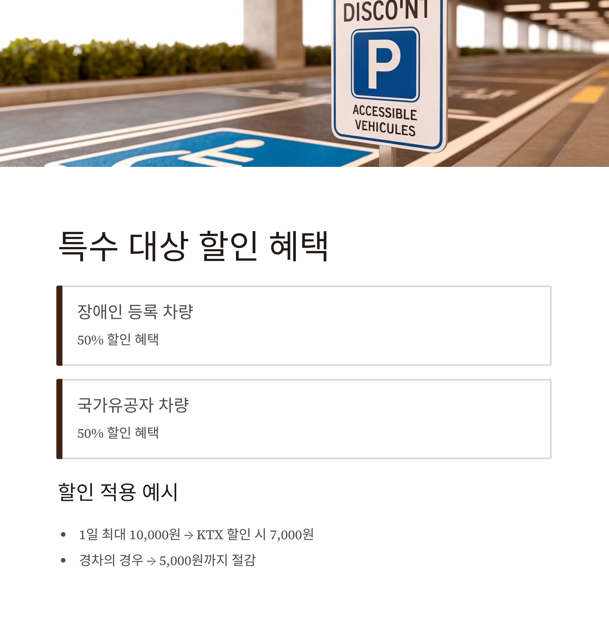 3~6시간의 중기 주차라면 할인을 최대한 활용하여 비용을 절감하는 것이 효과적입니다. KTX 승차권 30% 할인을 받으면 일반 주차 요금보다 훨씬 저렴하게 이용 가능합니다.