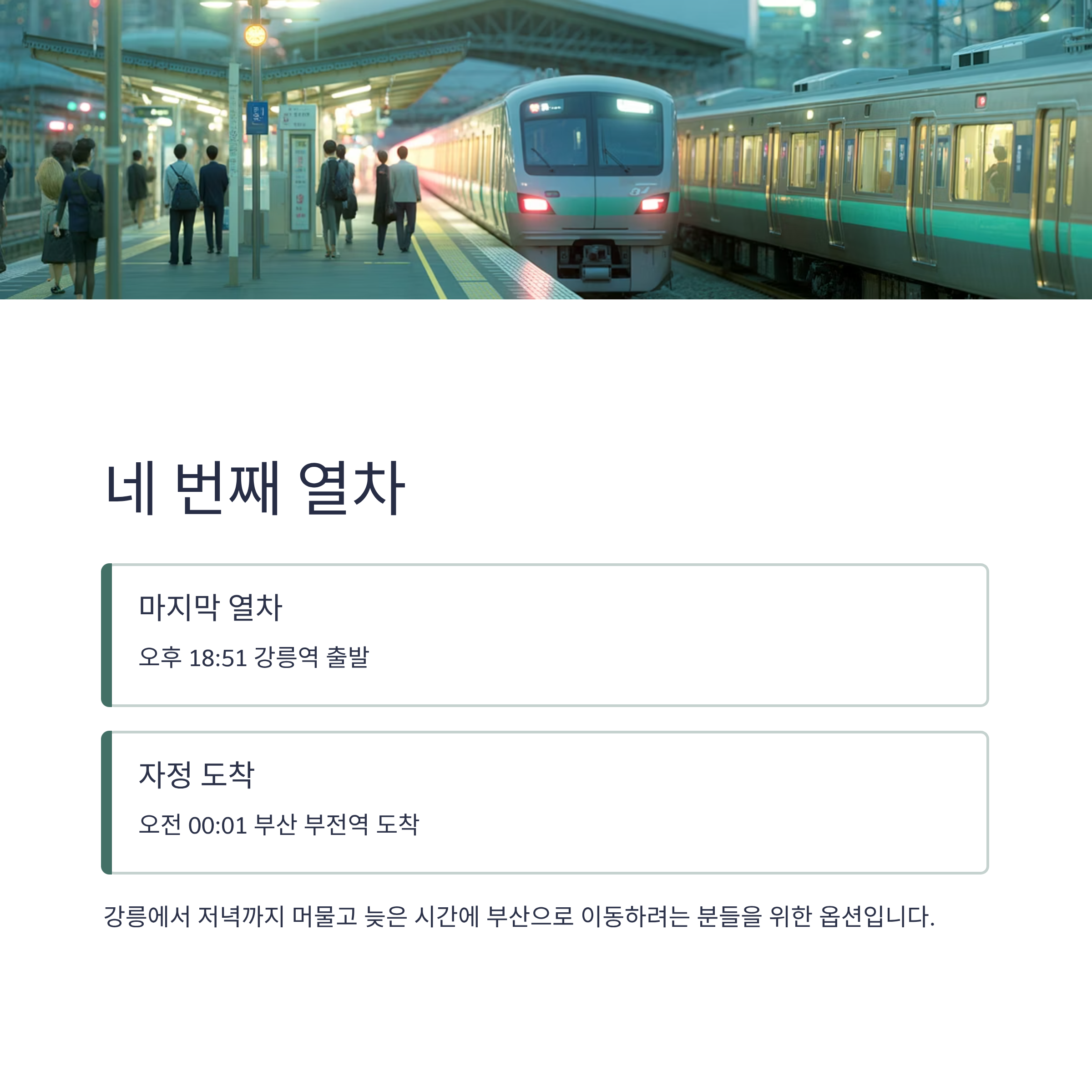 이 열차는 강릉에서 저녁까지 머물고 늦은 시간에 부산으로 이동하려는 분들을 위한 옵션입니다.