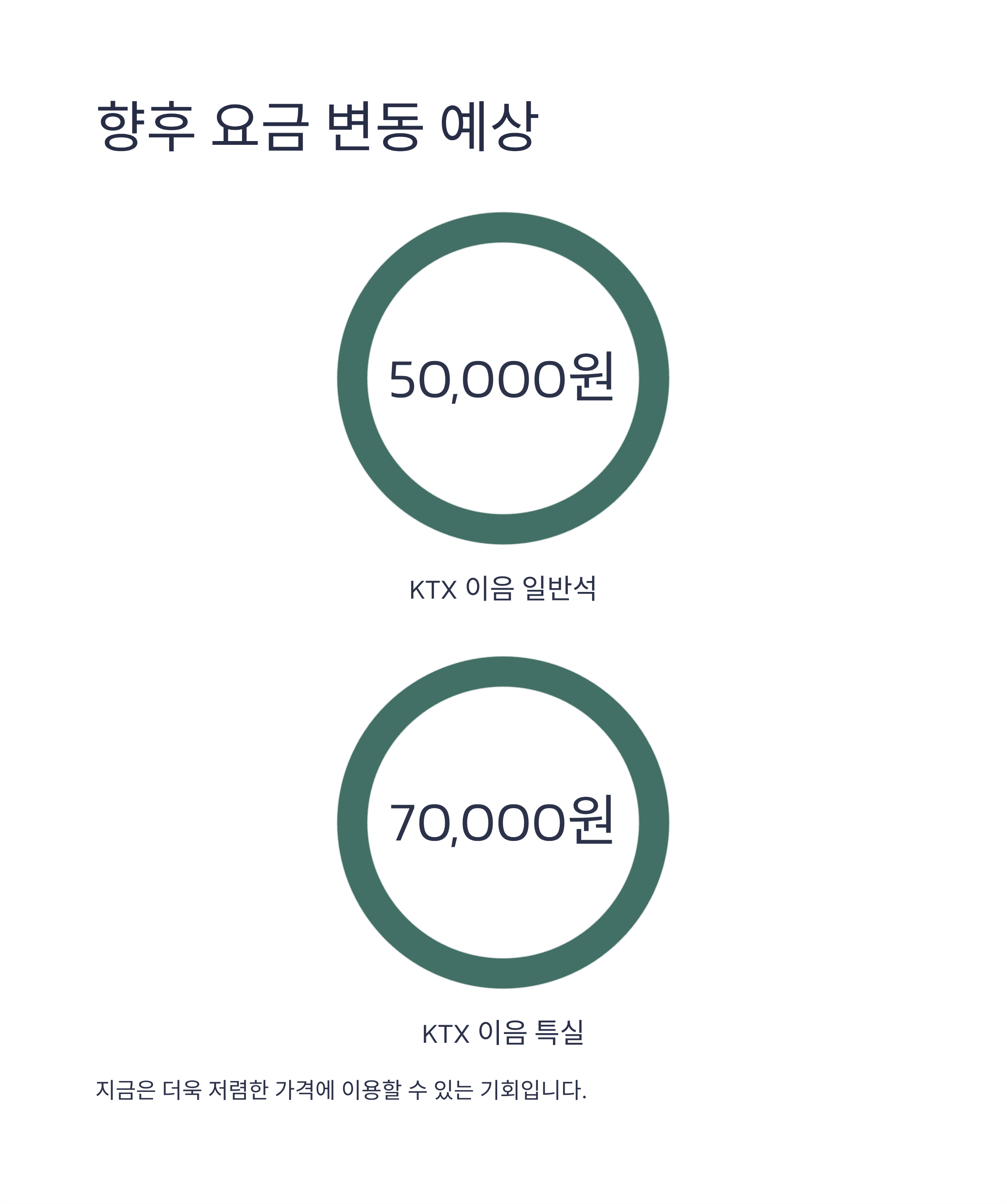 향후 KTX 이음이 투입될 경우 일반석은 약 50,000원, 특실은 약 70,000원대의 요금이 책정될 예정이므로, 지금은 더욱 저렴한 가격에 이용할 수 있는 기회입니다.