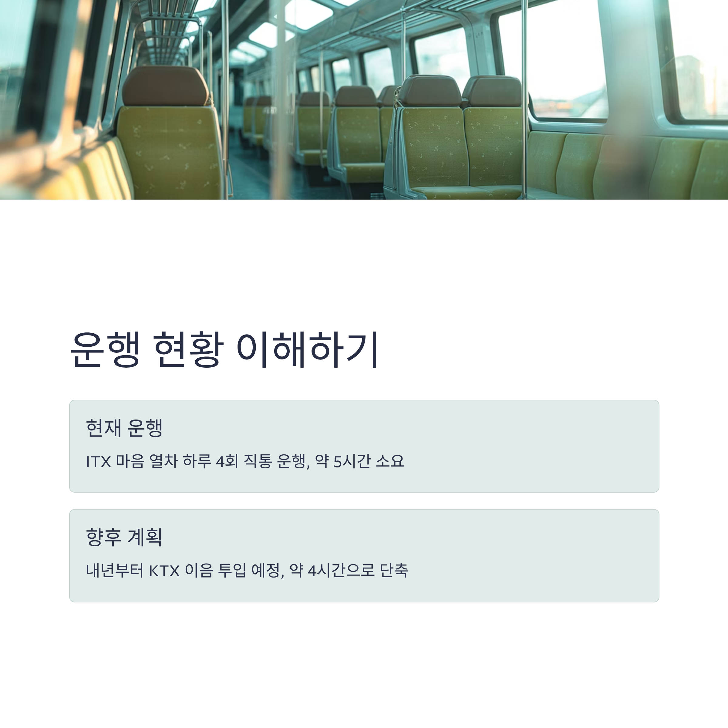 현재 ITX 마음은 약 5시간의 운행 시간이 소요되지만, KTX 이음이 도입되면 약 4시간으로 단축될 것으로 예상됩니다.