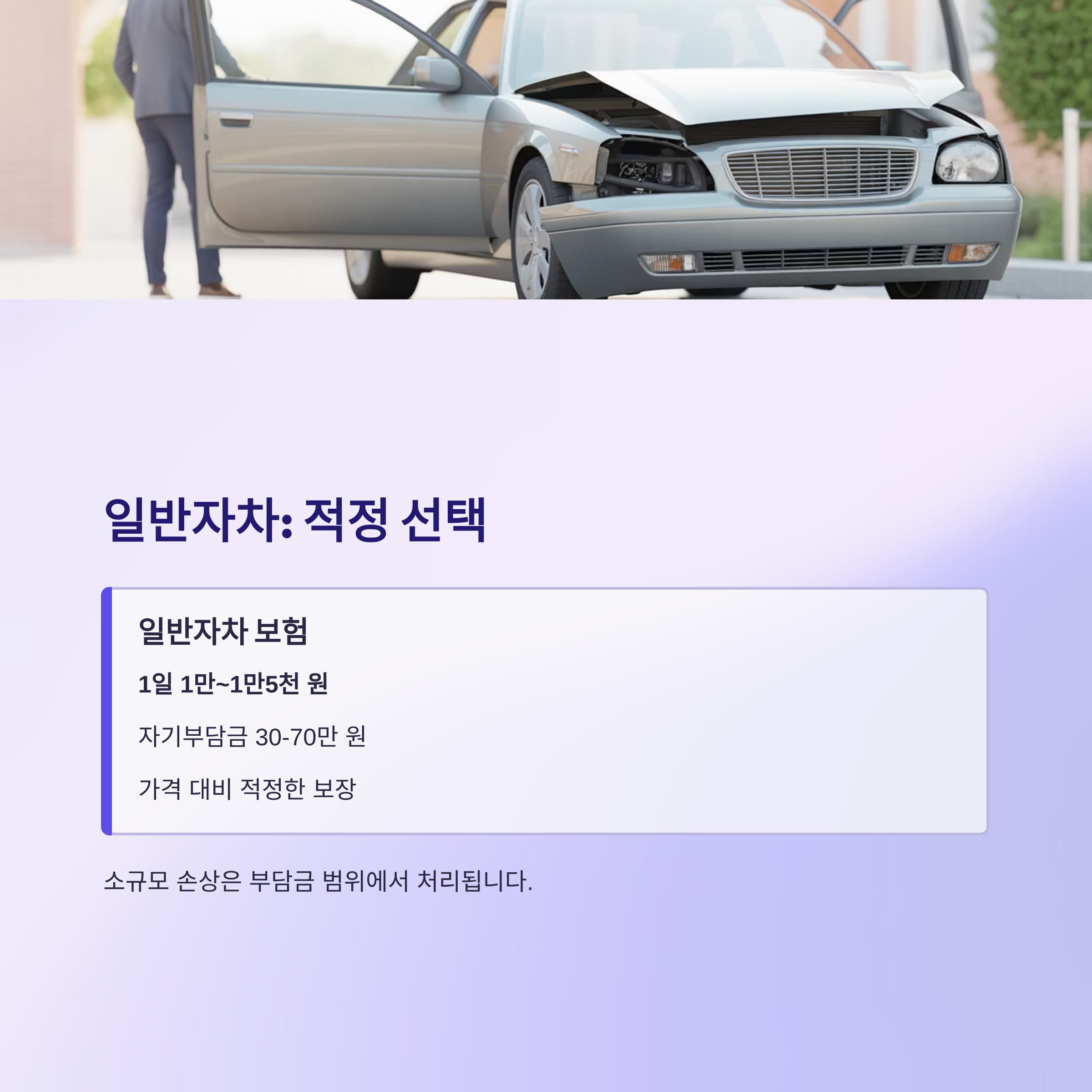 일반자차 보험은 1일 1만~1만5천 원의 추가 비용으로 자기부담금 30~70만 원을 보장하며, 가격 대비 적정한 선택입니다.