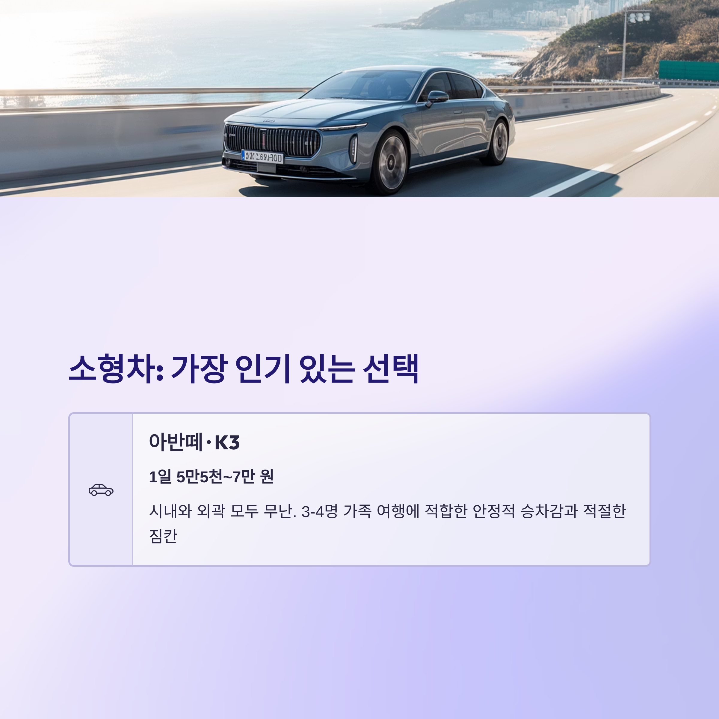 소형차 아반떼와 K3는 5만5천~7만 원대로 시내 주행과 외곽 모두 무난한 선택이며, 부산 여행객들이 가장 많이 선택하는 차종입니다.