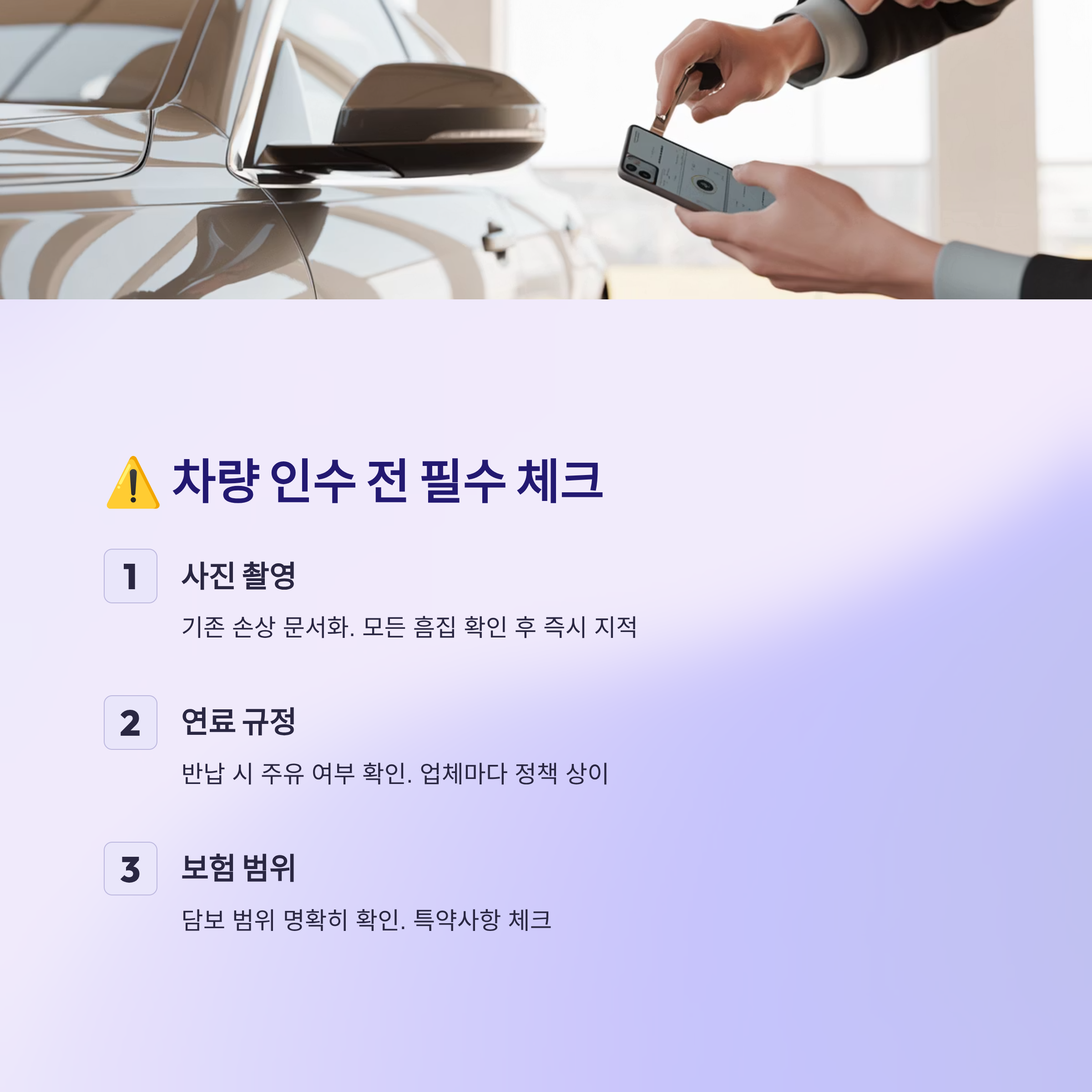 차량 인수 전에 반드시 사진을 촬영하여 기존 손상을 문서화해야 하며, 문제가 있으면 그 자리에서 지적하고 기록하는 것이 중요합니다.