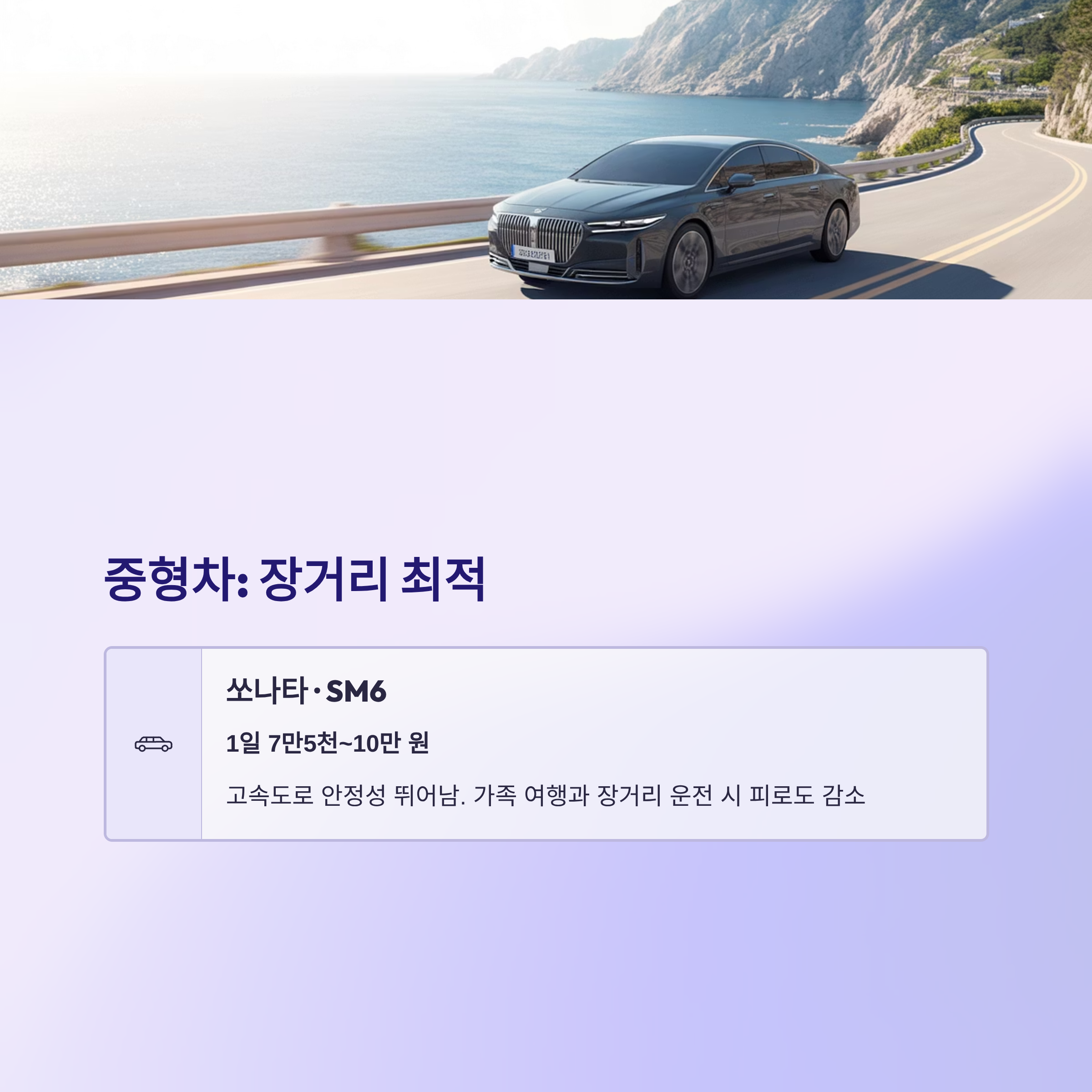 중형차 쏘나타와 SM6은 7만5천~10만 원대로 고속도로 주행 시 안정성이 뛰어나며, 가족 단위 여행에 적합합니다.