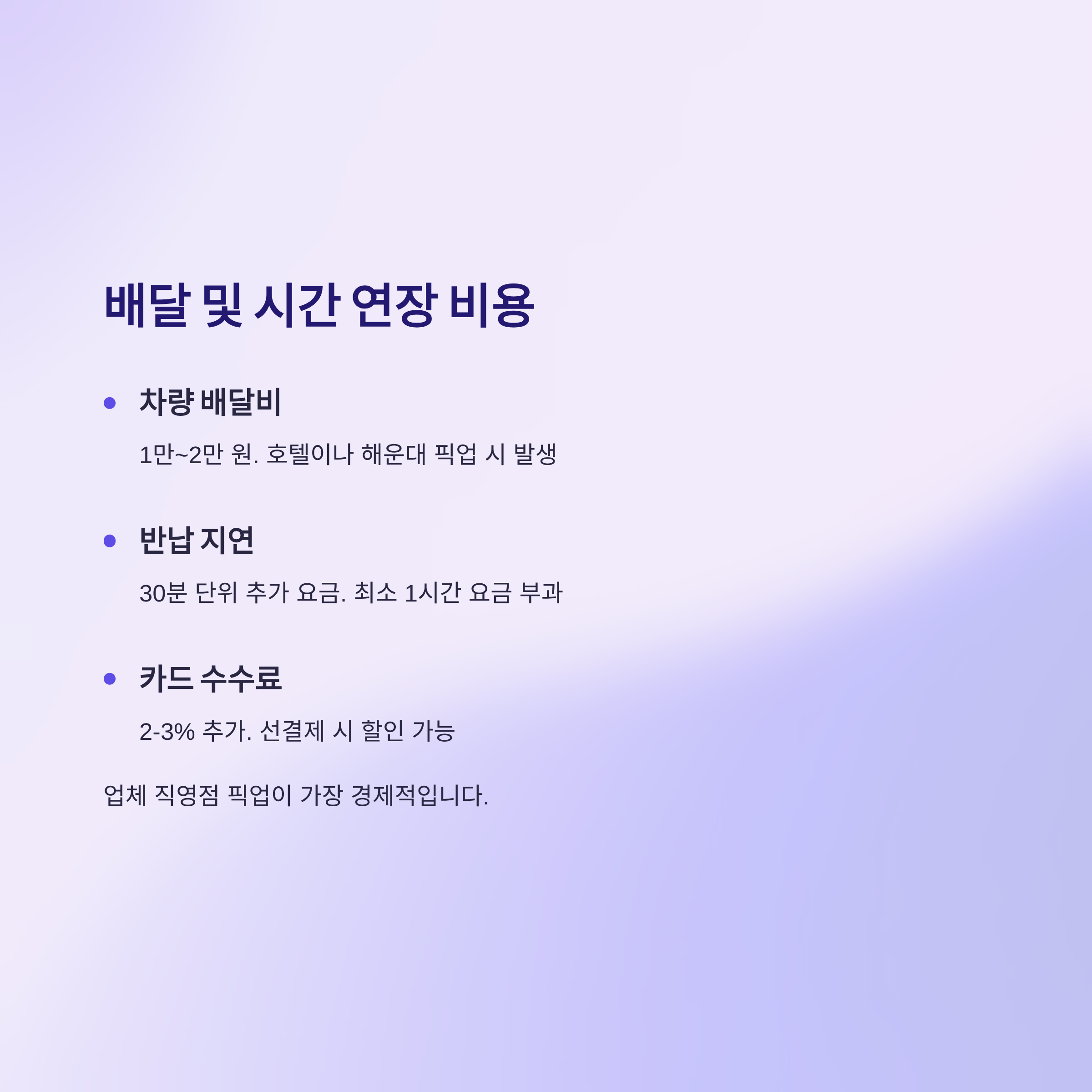 차량 배달비는 1만~2만 원이 부과되며, 호텔이나 해운대 지역 픽업을 요청할 때 발생합니다.