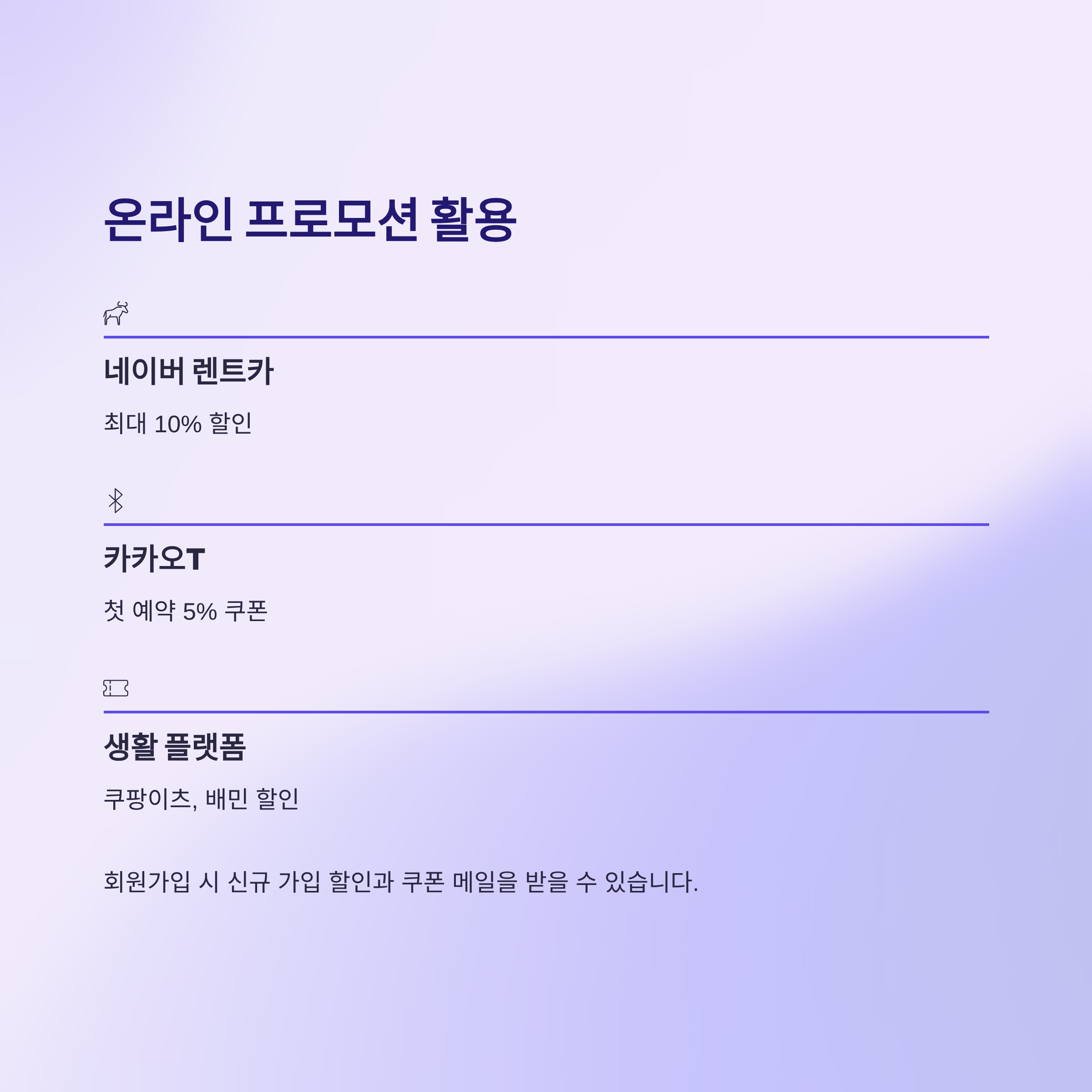 온라인 프로모션은 네이버 렌트카에서 최대 10% 할인을 진행 중이며, 카카오T 렌트카는 첫 예약 시 5% 할인 쿠폰을 제공합니다.