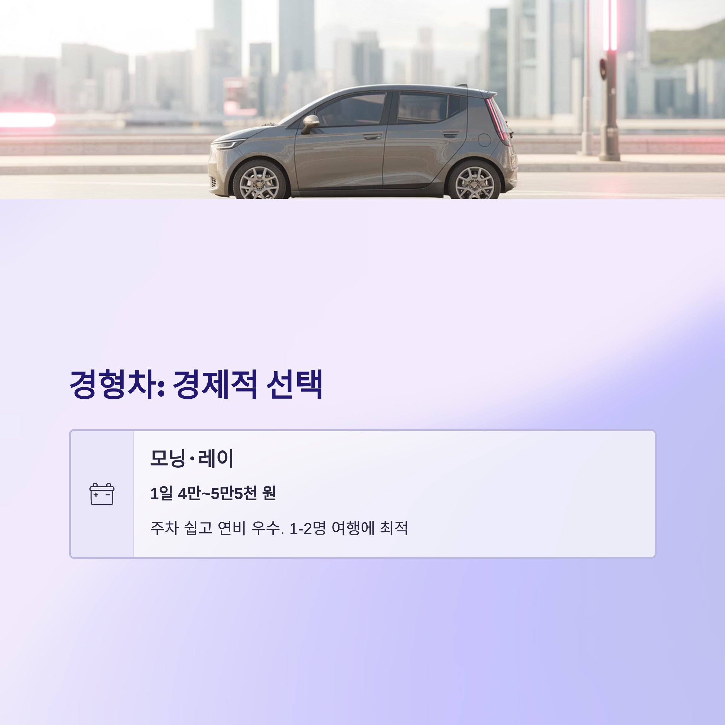 경형차 모닝과 레이는 1일 4만~5만5천 원대에 이용 가능하며, 주차가 쉽고 연비가 우수한 장점이 있습니다.