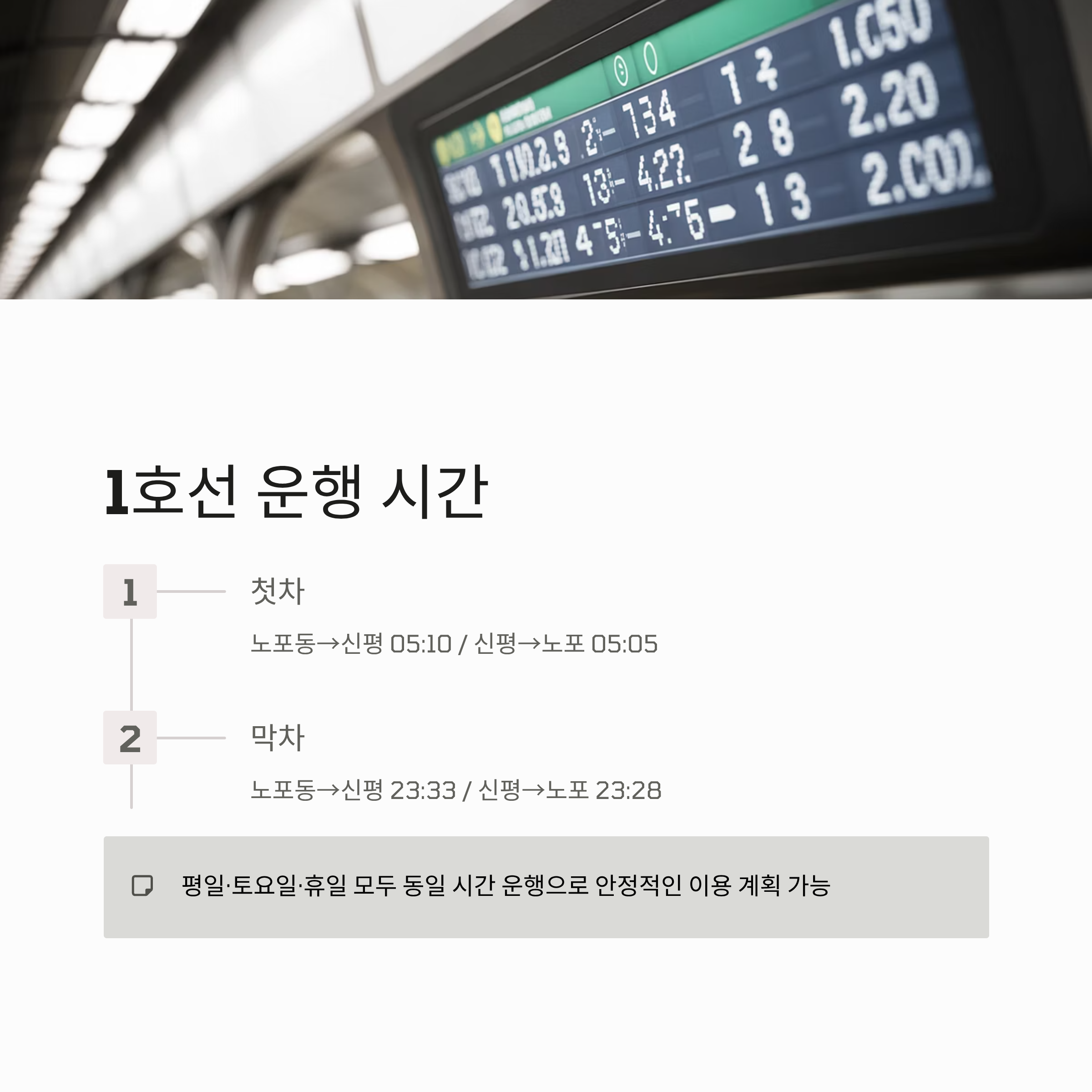 1호선의 첫차는 노포동역에서 신평 방면 오전 5시 10분, 신평역에서 노포 방면 오전 5시 5분에 각각 출발하며, 막차는 노포동역에서 신평 방면 오후 11시 33분, 신평역에서 노포 방면 오후 11시 28분입니다.
