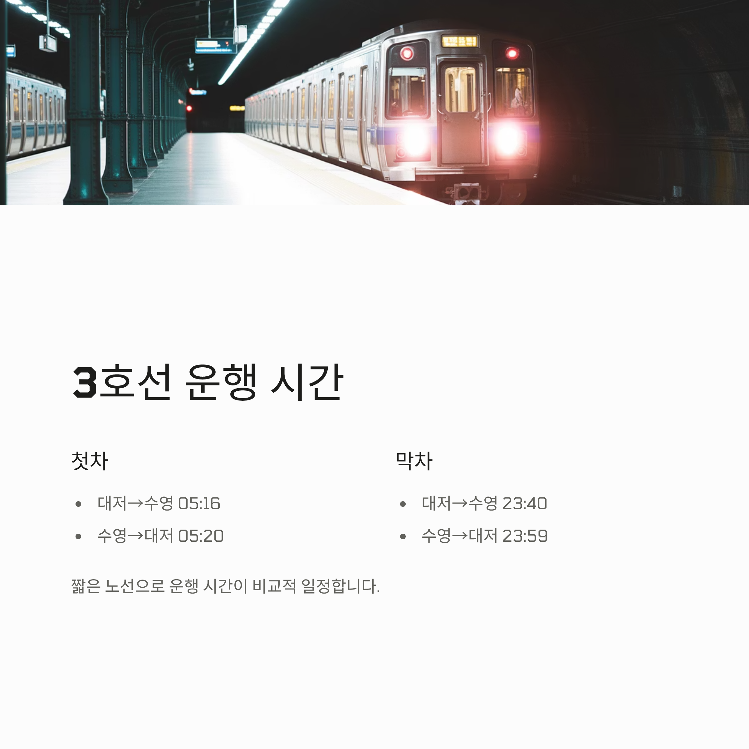 3호선은 노선이 짧아 운행 시간도 비교적 일정합니다.