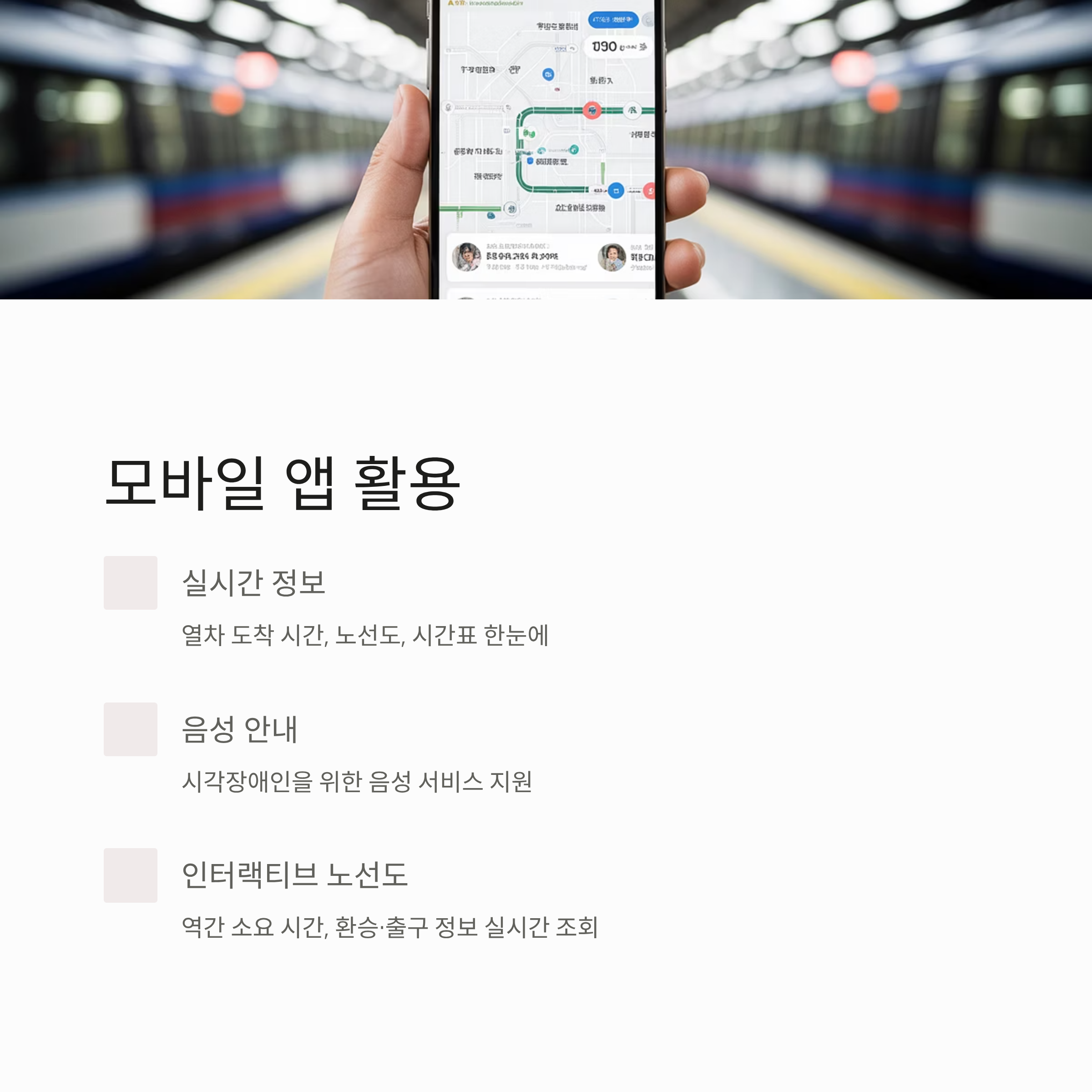 모바일 앱을 미리 설치하고 즐겨찾기에 자주 가는 역들을 등록하면 빠르게 정보를 확인할 수 있습니다. 혼잡 시간대인 오전 7~9시와 오후 5~7시를 피하면 더 편한 이동이 가능합니다.