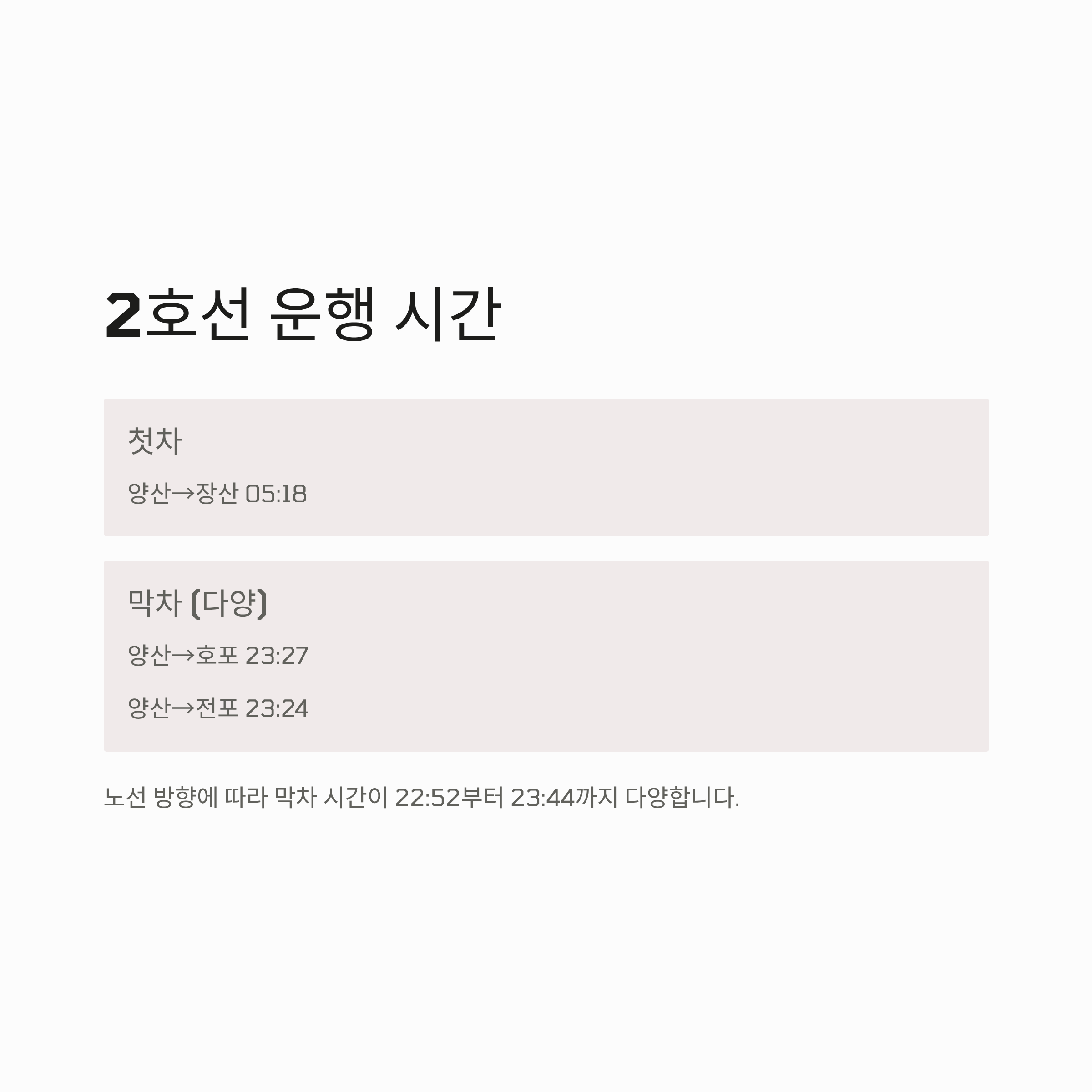 2호선의 첫차는 양산역에서 장산 방면 오전 5시 18분이며, 막차는 노선 방향에 따라 오후 10시 52분부터 오후 11시 44분까지 다양합니다.