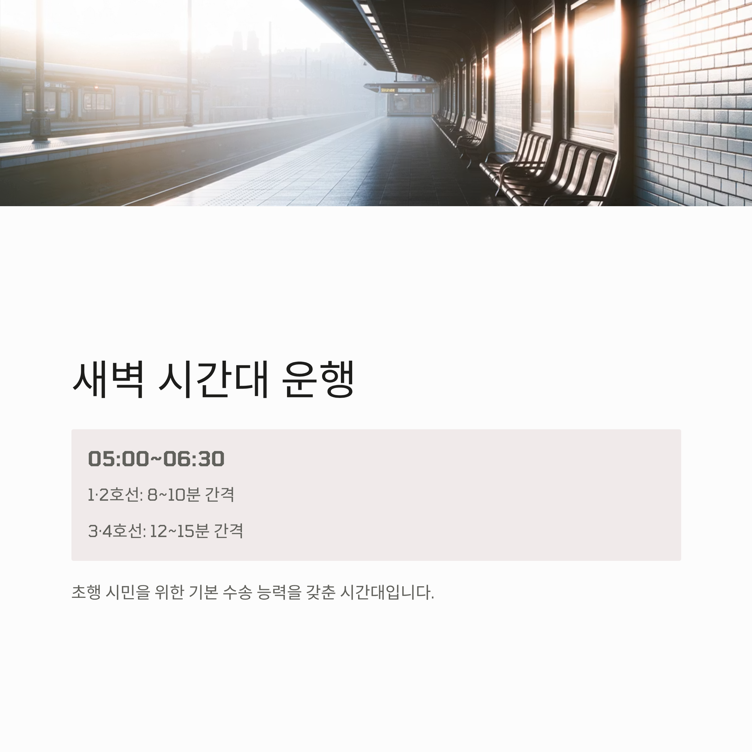 새벽 시간대인 오전 5시부터 6시 30분까지는 1호선과 2호선은 약 8~10분 간격, 3호선과 4호선은 12~15분 간격으로 운행됩니다. 초행 시민들을 위한 기본적인 수송 능력을 갖추고 있습니다.
