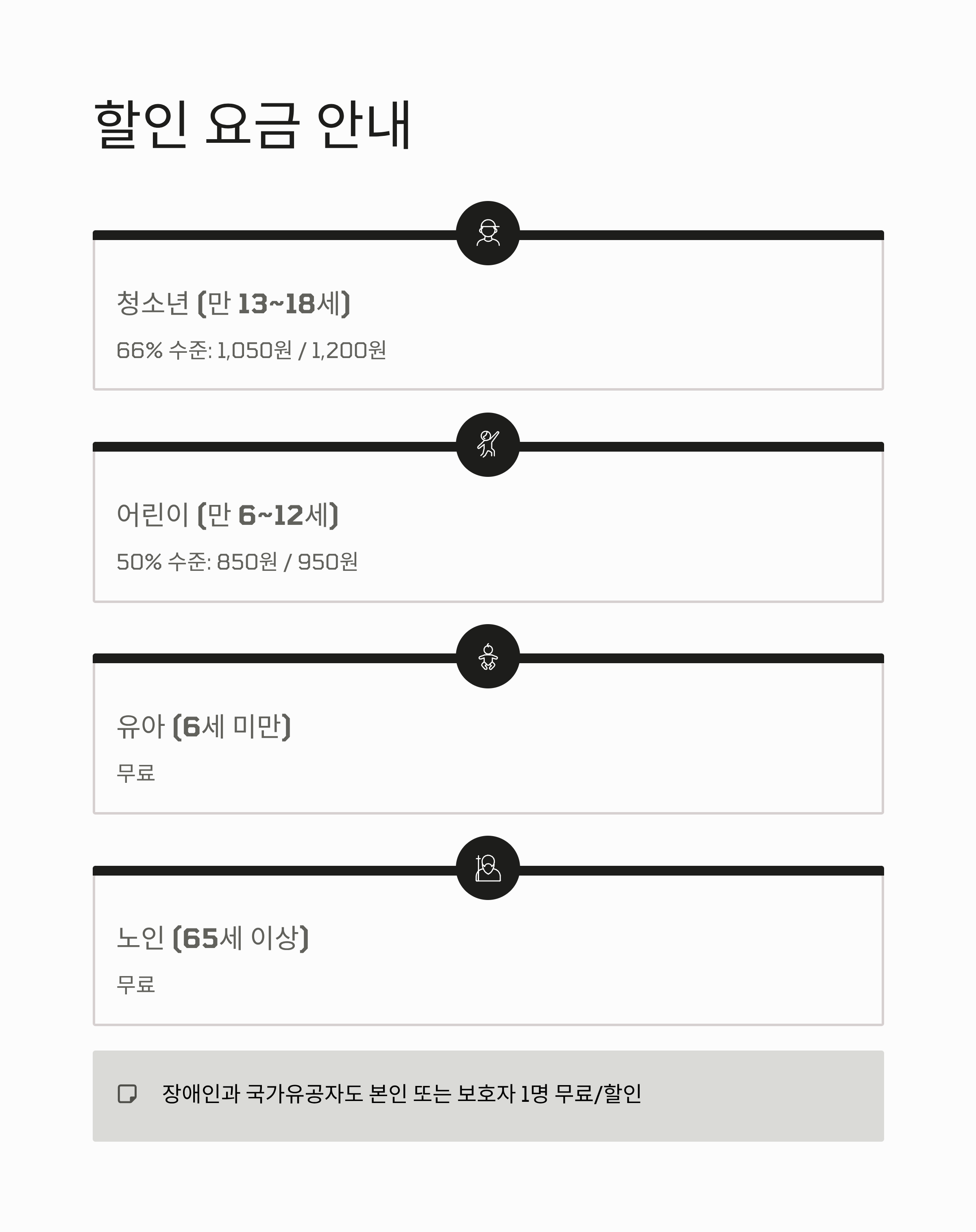 장애인과 국가유공자도 본인 또는 보호자 1명이 무료이거나 할인을 받습니다.