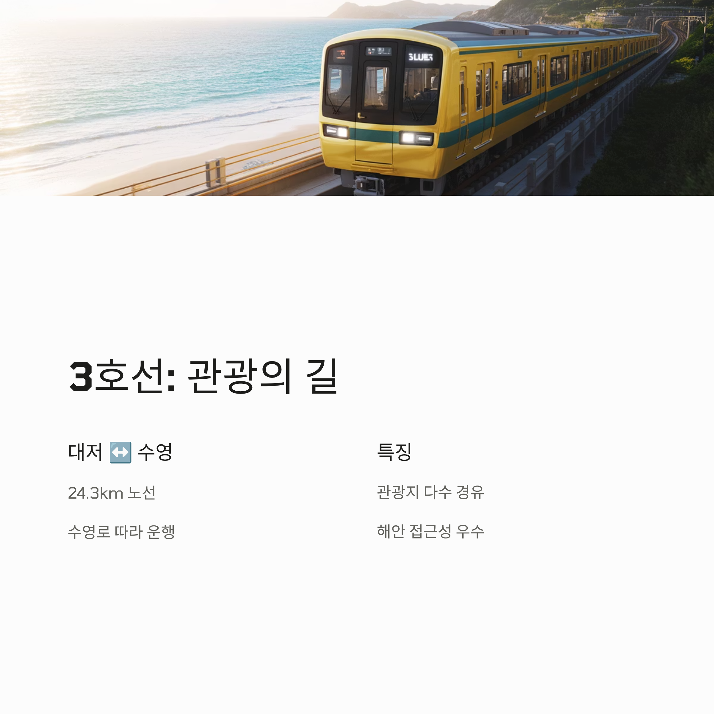 3호선은 대저역에서 수영역까지 운행되는 24.3km의 노선으로 수영로를 따라 관광지를 많이 거칩니다.