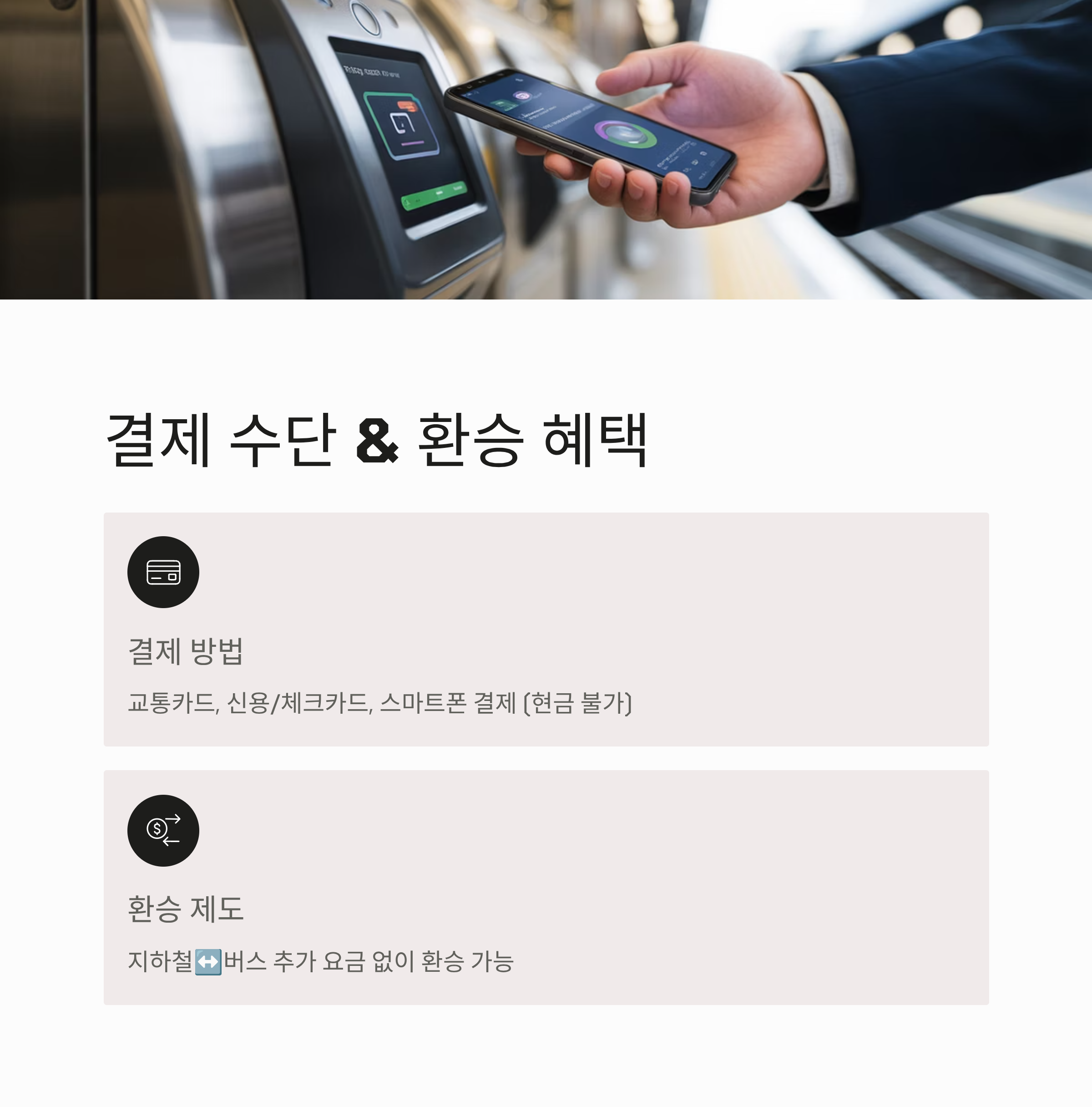 현금 결제는 불가능하며, 교통카드, 신용카드, 체크카드, 스마트폰 결제(카카오페이, 삼성페이 등)로만 결제 가능합니다.