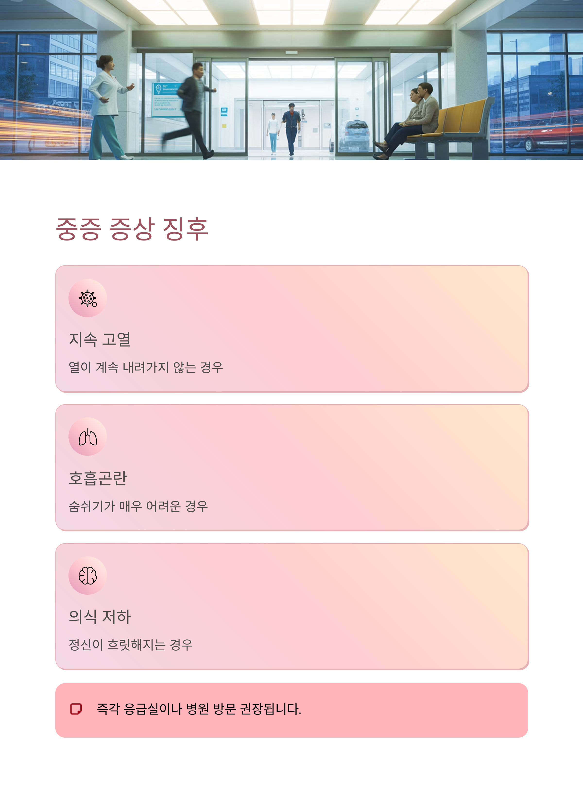 지속 고열, 호흡곤란, 의식 저하 시 즉각 응급실이나 병원 방문 권장됩니다.