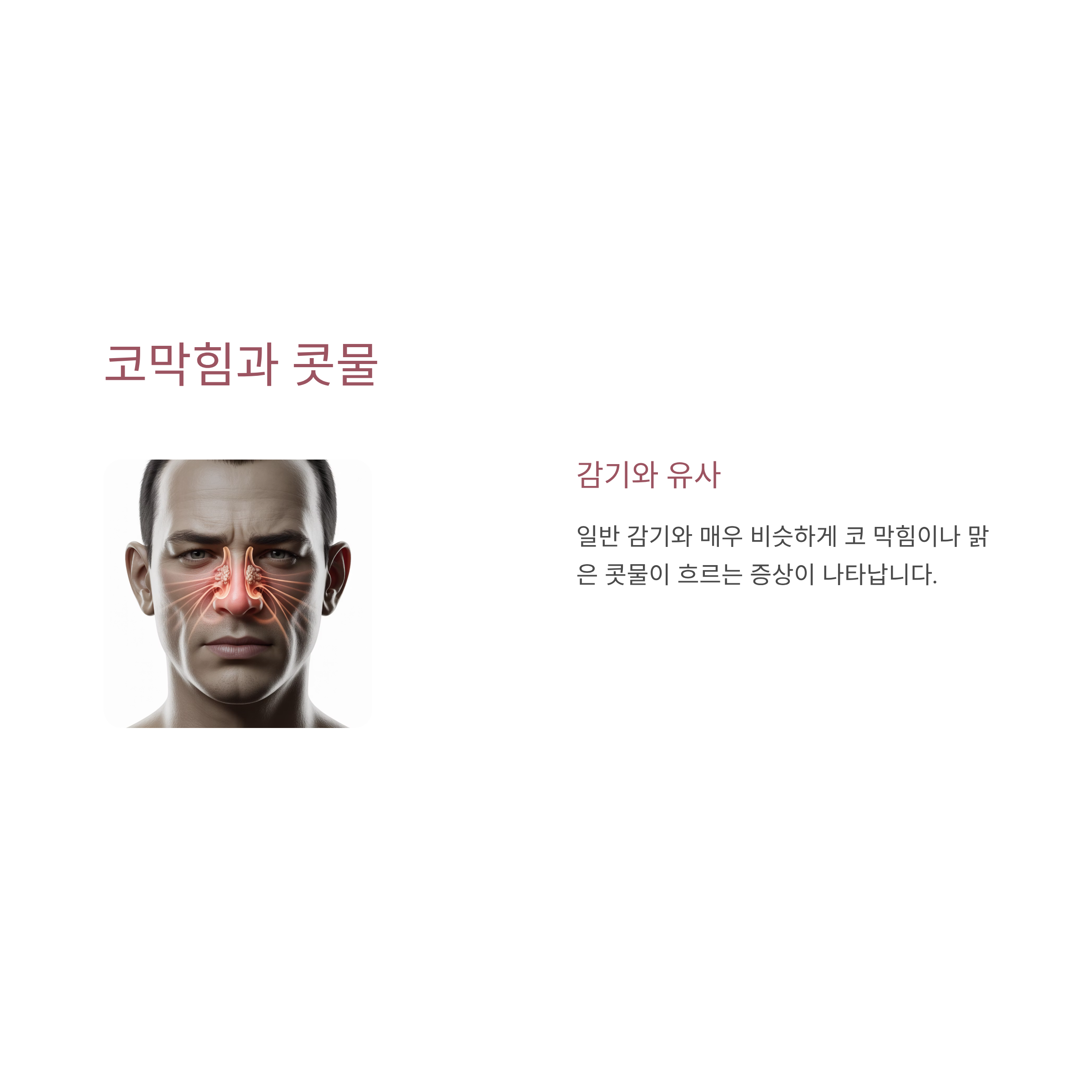 일반 감기와 매우 비슷하게 코 막힘이나 맑은 콧물이 흐르는 증상이 나타납니다.