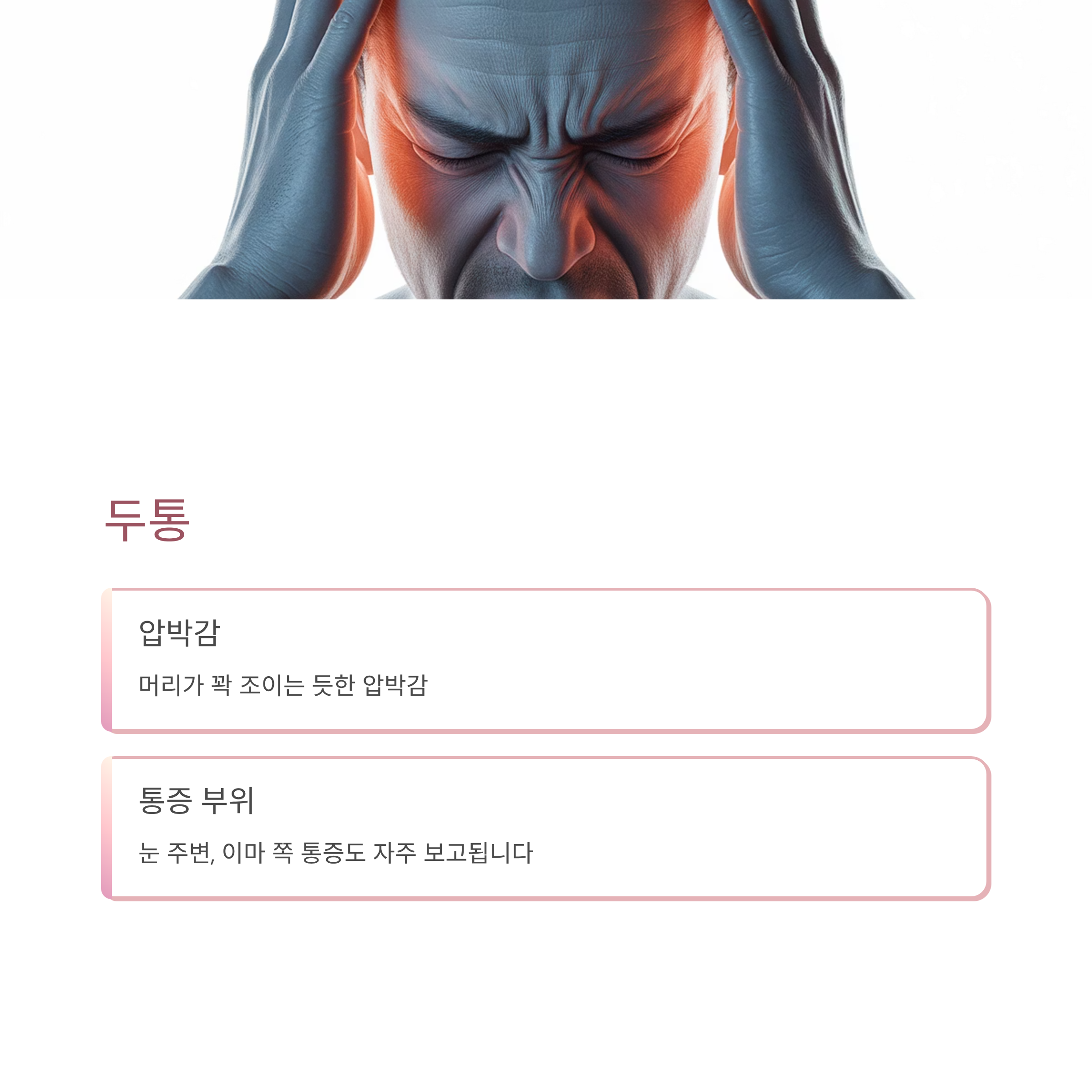머리가 꽉 조이는 듯한 압박감과 눈 주변, 이마 쪽 통증도 자주 보고됩니다.