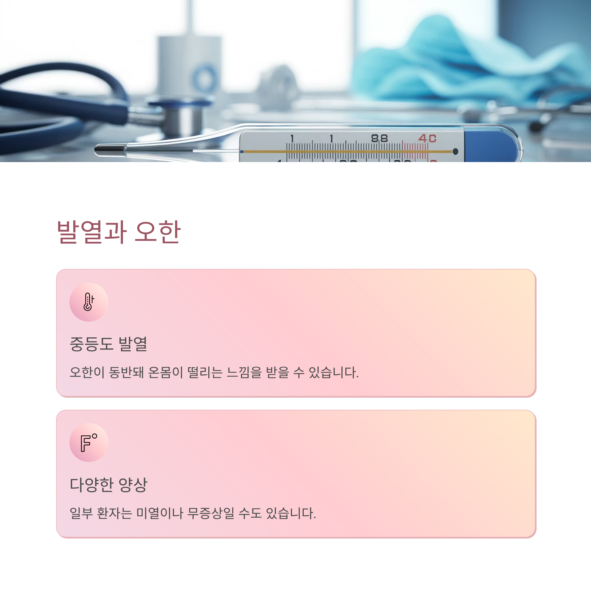 중등도 발열이 나타나며, 오한이 동반돼 온몸이 떨리는 느낌을 받을 수 있습니다.