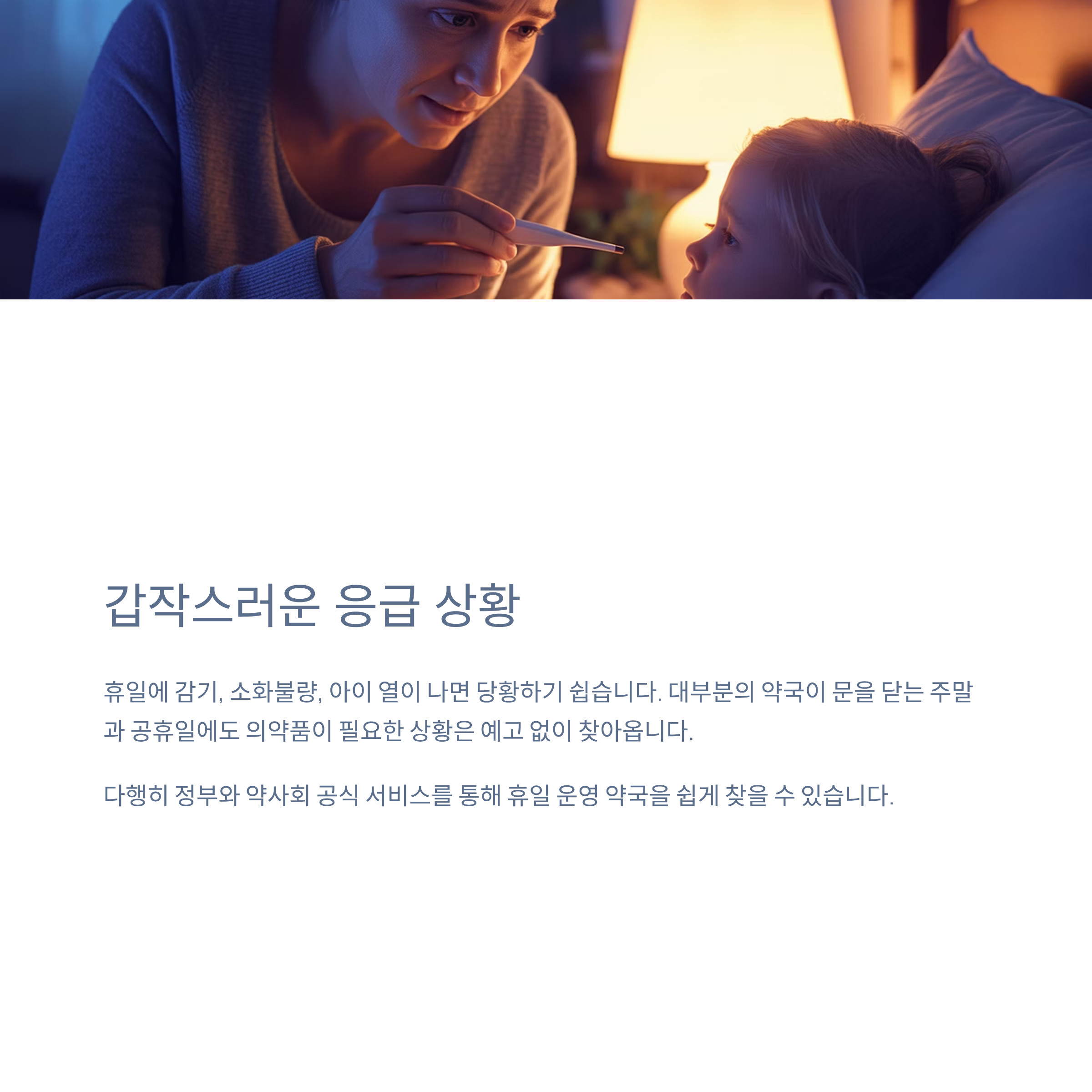 휴일에 갑자기 감기, 소화불량, 아이 열이 나면 당황하기 쉽습니다.