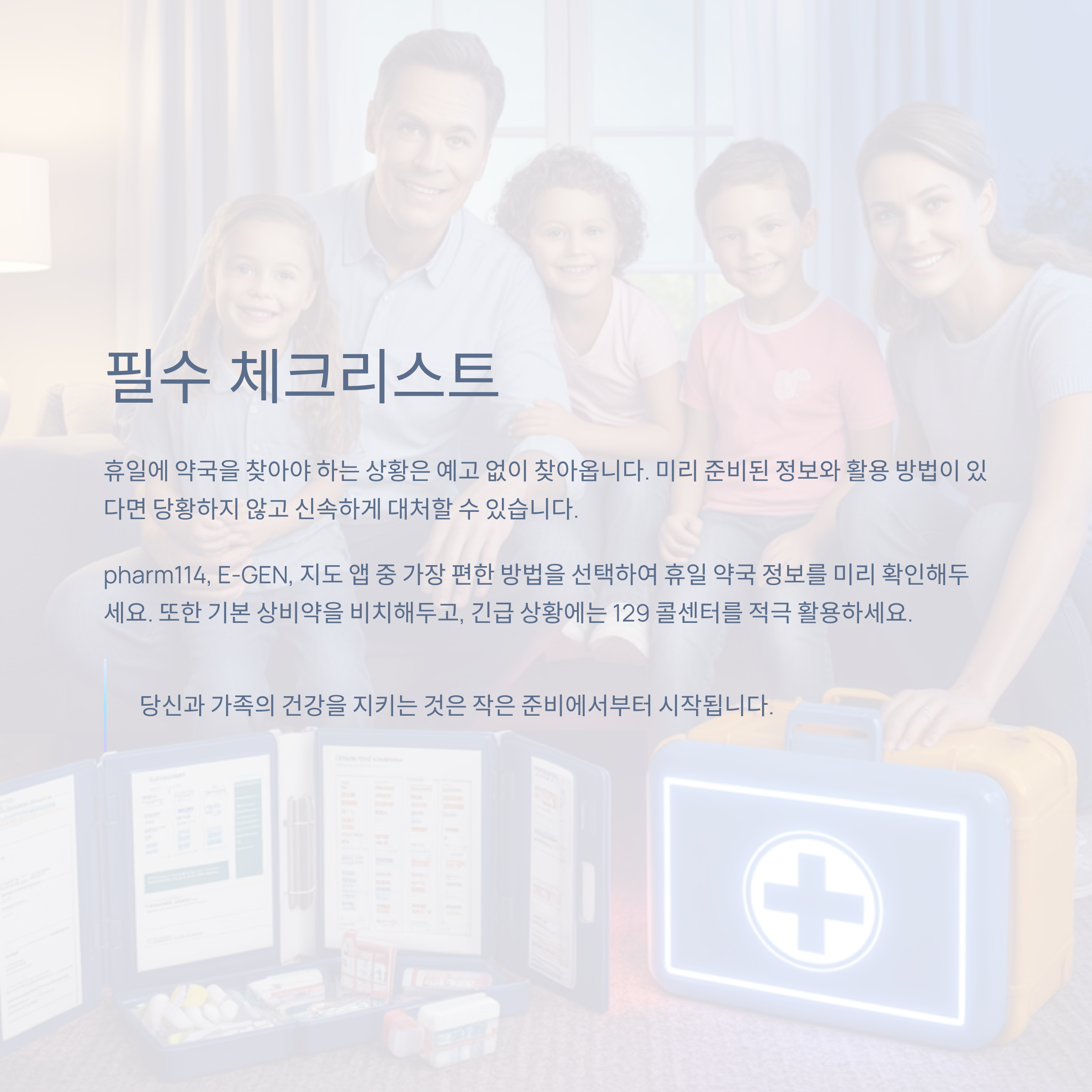 휴일에 약국을 찾아야 하는 상황은 예고 없이 찾아옵니다. 미리 준비된 정보와 활용 방법이 있다면 당황하지 않고 신속하게 대처할 수 있습니다. pharm114, E-GEN, 지도 앱 중 가장 편한 방법을 선택하여 휴일 약국 정보를 미리 확인해두세요. 또한 기본 상비약을 비치해두고, 긴급 상황에는 129 콜센터를 적극 활용하세요. 당신과 가족의 건강을 지키는 것은 작은 준비에서부터 시작됩니다.